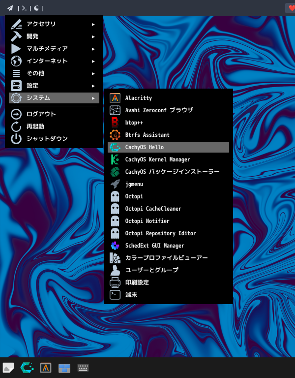 「スタート」→「システムツール」→「CachyOS Hello」