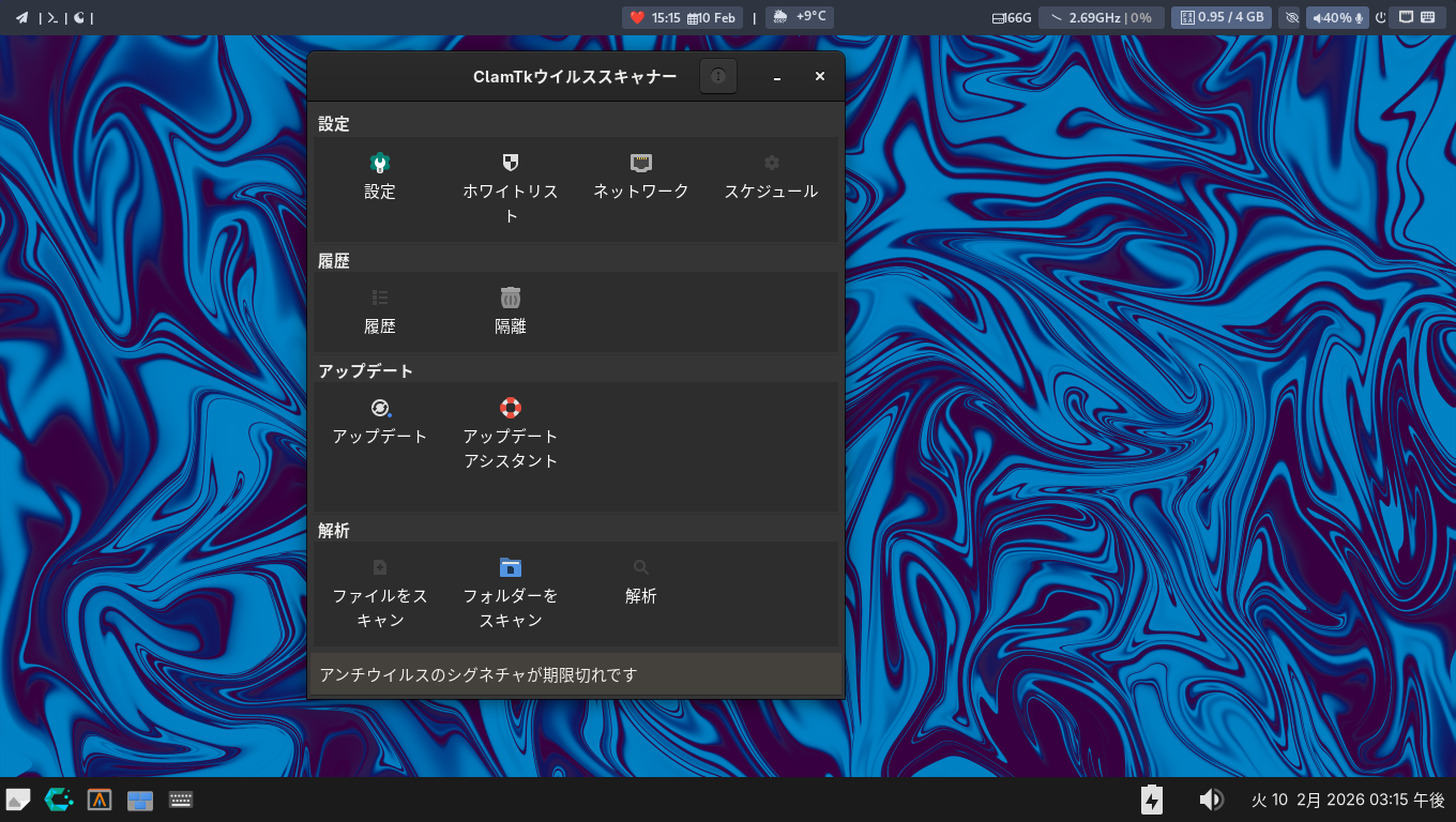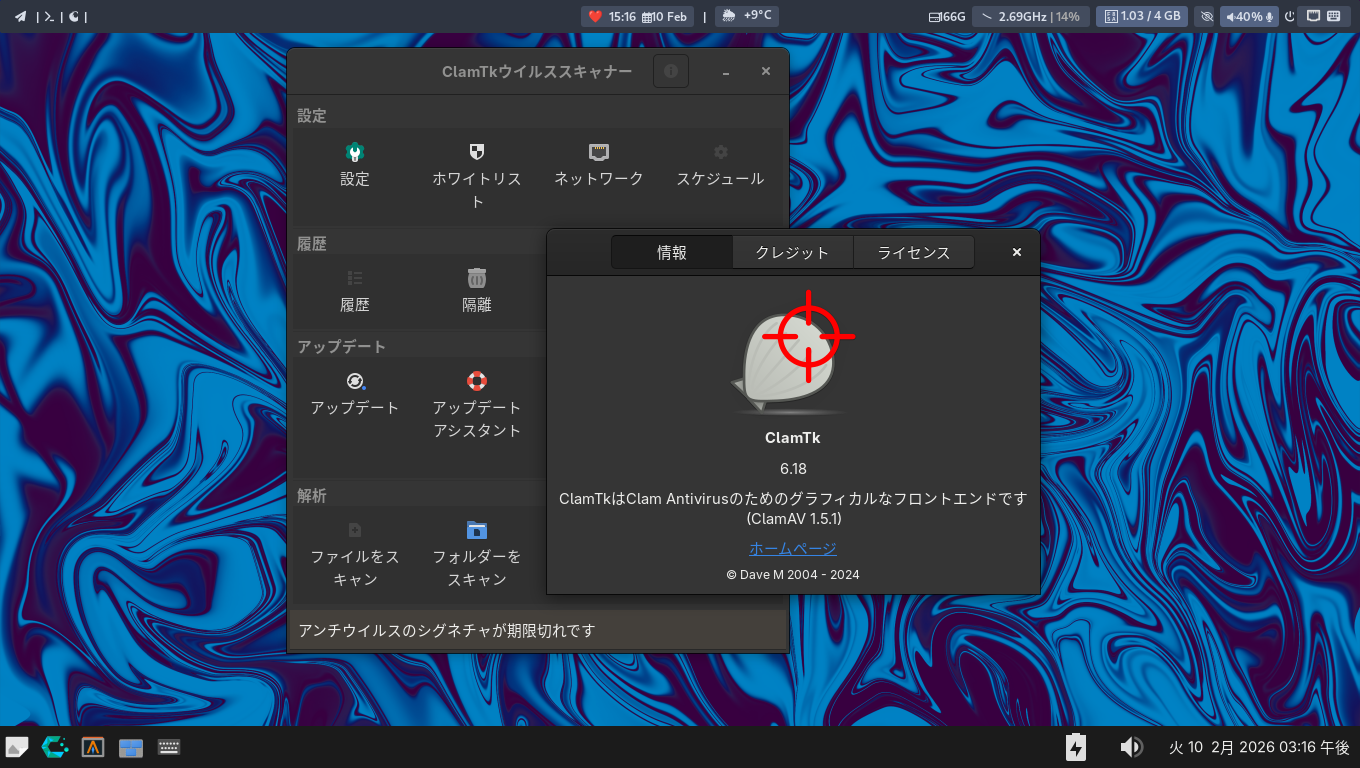 1. 概要 「ClamTk」は、「GUI」で操作するアンチウィルスソフトです。 2. インストール 「Pamac」で、「clamtk」を検索してインストールします。 3. 起動 「スタート」→「アクセサリ」→「ClamTk」