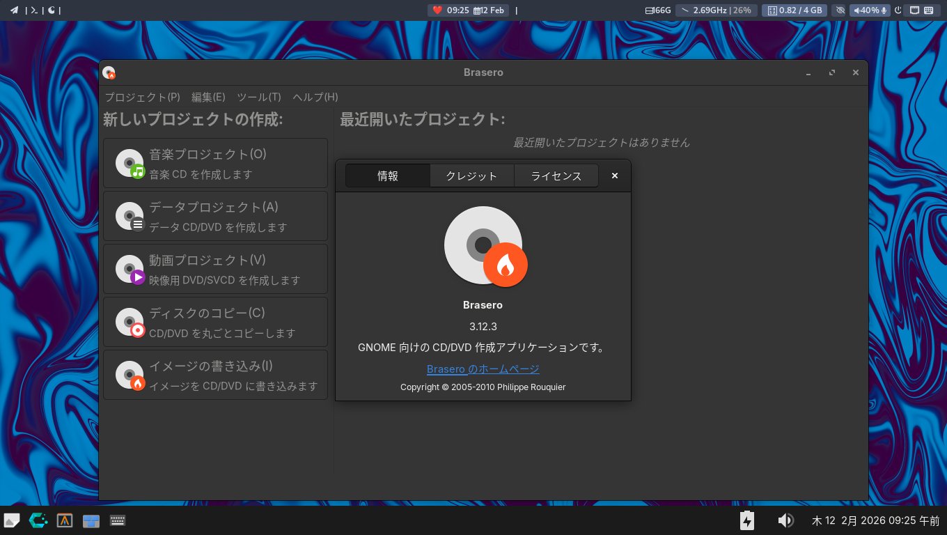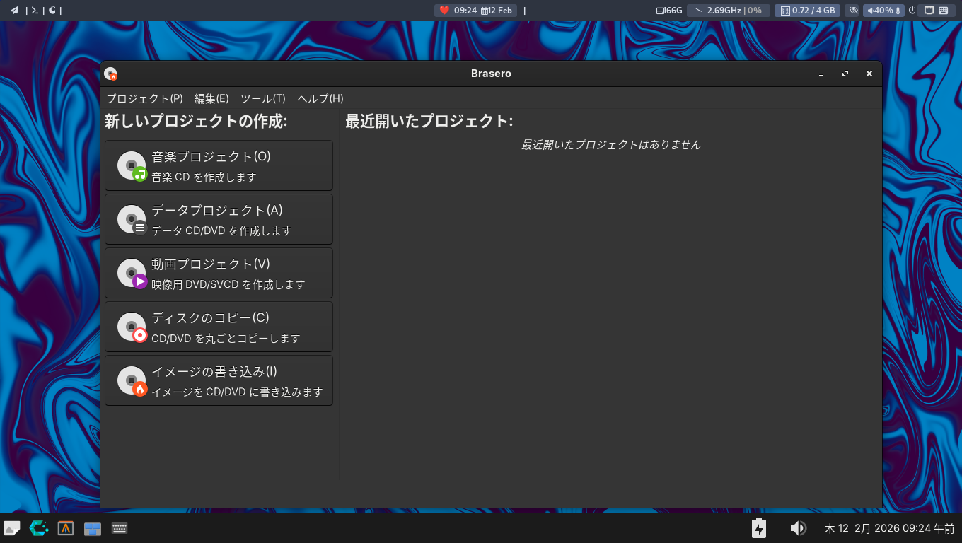 1. 概要 光ディスクライティングソフトとして、「Brasero」を使用します。 2. インストール 「Pamac」で、「brasero」を検索して、インストールします。 3. 起動 「スタート」→「マルチメディア」→「Brasero」