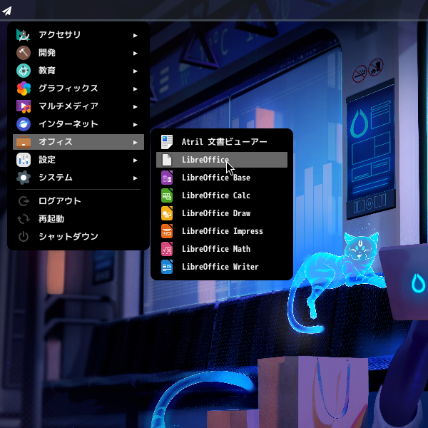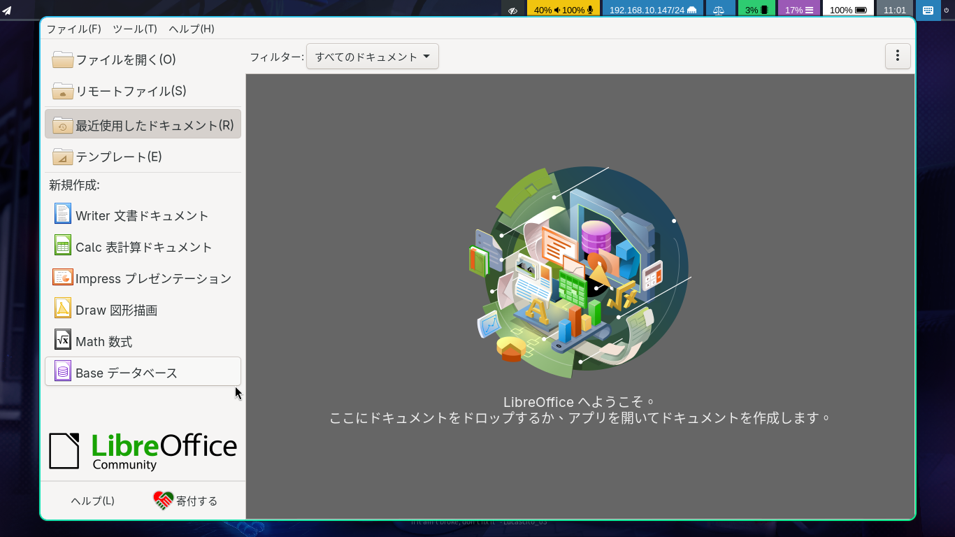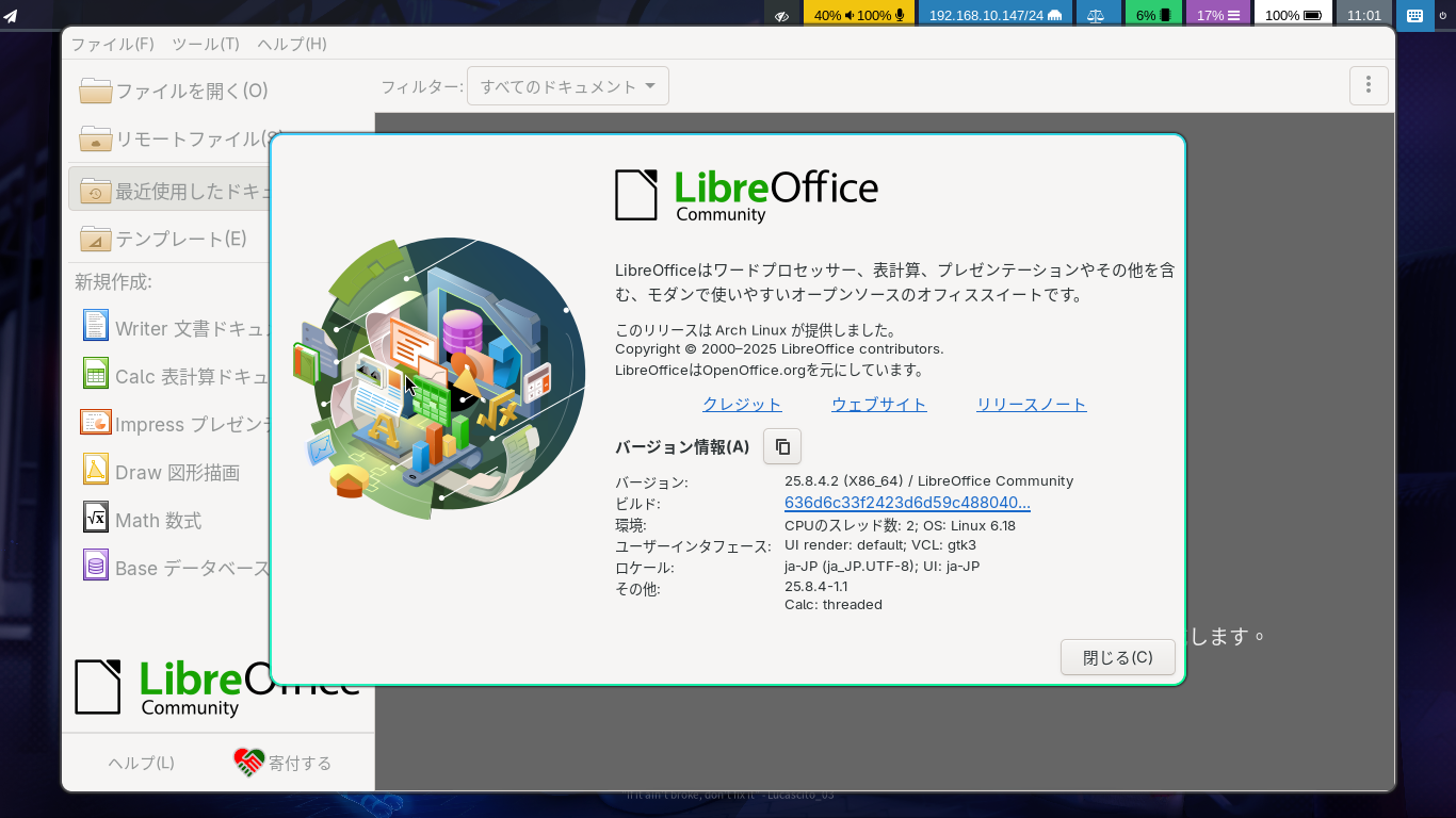 1. 概要 オフィススイートとして、「LibreOffice」を使用します。 2. インストール 「Octopi」で、「libreoffice-ja」を検索して、「libreoffice-still-ja」をインストールします。 3. 起動 「スタート」→「オフィス」→「LibreOffice」