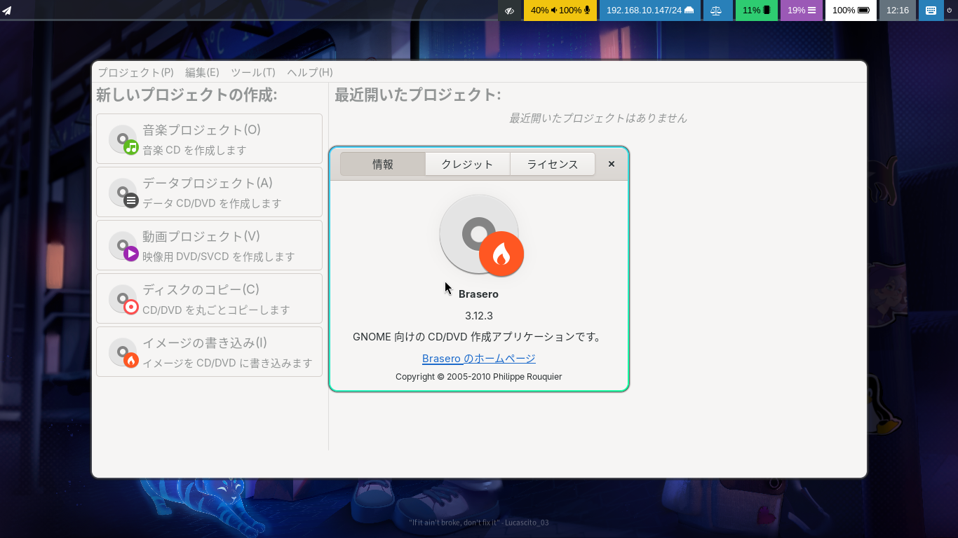 1. 概要 光ディスクライティングソフトとして、「Brasero」を使用します。 2. インストール 「root」ユーザ権限で。 yes | pacman -S brasero 3. 起動 「スタート」→「マルチメディア」→「Brasero」