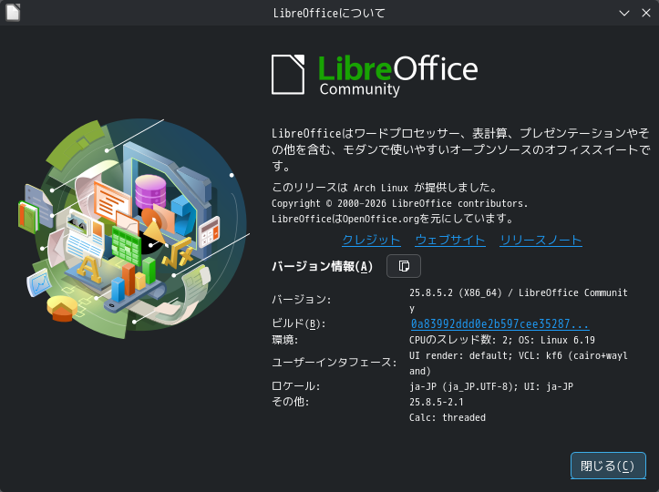 1. 概要 オフィススイートとして、「LibreOffice」を使用します。 2. インストール 「Octopi」で、「libreoffice-ja」を検索して、「libreoffice-still-ja」をインストールします。 3. 起動 「スタート」→「オフィス」→「LibreOffice」