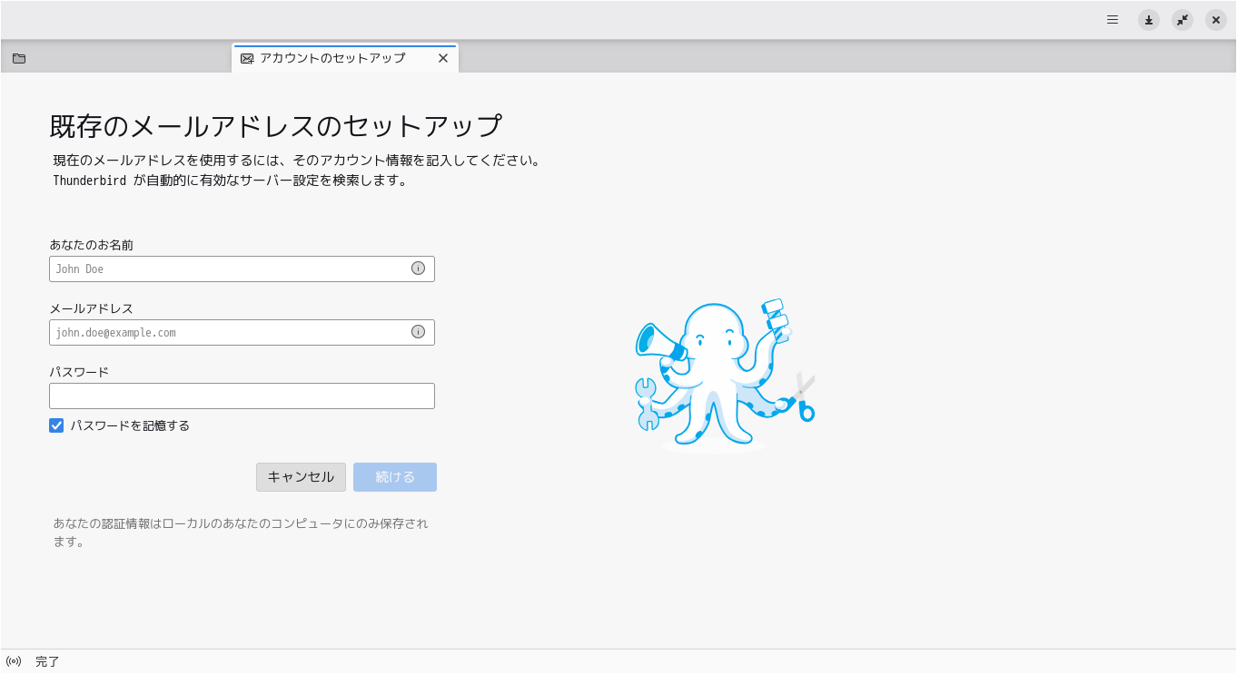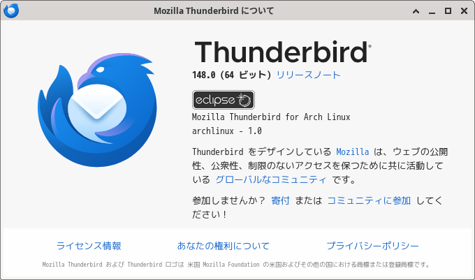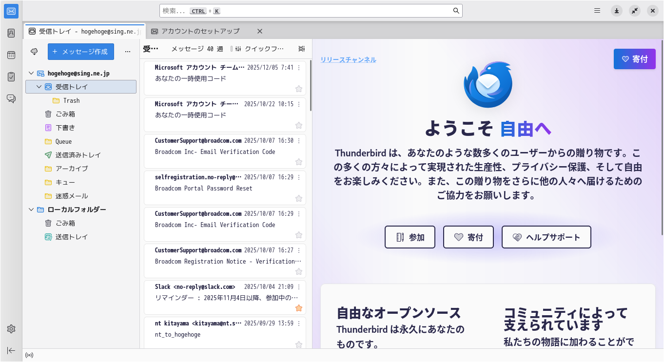 初回起動時は、「アカウント設定」が起動します。 起動直後に、受信ボックスを開いた状態です。 2026年3月9日の時点で、下記のバージョンでした。 操作方法等は「メール クライアント ソフト - Thunderbird」をご参照ください。 |