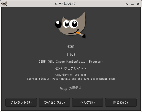 「閉じる」 起動直後の状態です。 2026年3月10日の時点で、下記のバージョンでした。 操作については、「画像編集ソフト - GIMP」に掲載しています。 上記は簡単なものですので、詳細なものがほしい方は、各所に初歩の手引きから応用編までありますので、そちらを参考にしてください。 |
