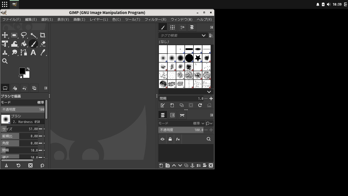 「閉じる」 起動直後の状態です。 2026年3月10日の時点で、下記のバージョンでした。 操作については、「画像編集ソフト - GIMP」に掲載しています。 上記は簡単なものですので、詳細なものがほしい方は、各所に初歩の手引きから応用編までありますので、そちらを参考にしてください。 |