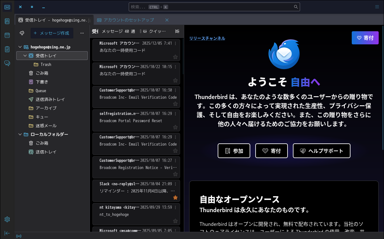 初回起動時は、「アカウント設定」が起動します。 起動直後に、受信ボックスを開いた状態です。 2026年3月11日の時点で、下記のバージョンでした。 操作方法等は「メール クライアント ソフト - Thunderbird」をご参照ください。 |