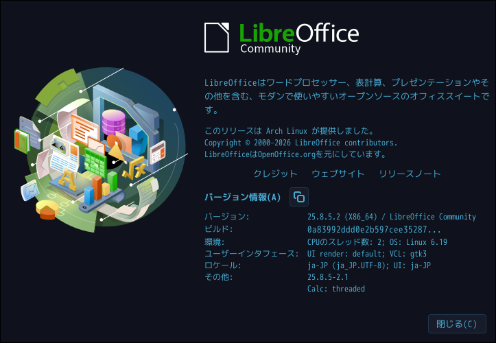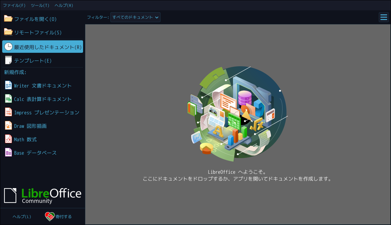 1. 概要 オフィススイートとして、「LibreOffice」を使用します。 2. インストール 「Octopi」で、「libreoffice-ja」を検索して、「libreoffice-still-ja」をインストールします。 3. 起動 「スタート」→「オフィス」→「LibreOffice」