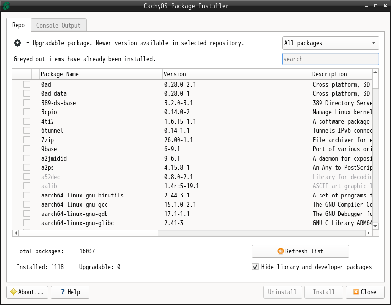 起動直後の状態です。 2026年3月12日の時点で、下記のバージョンでした。 操作方法等は「Linux - 共通事項 - パッケージ管理フロントエンド」をご参照ください。 |