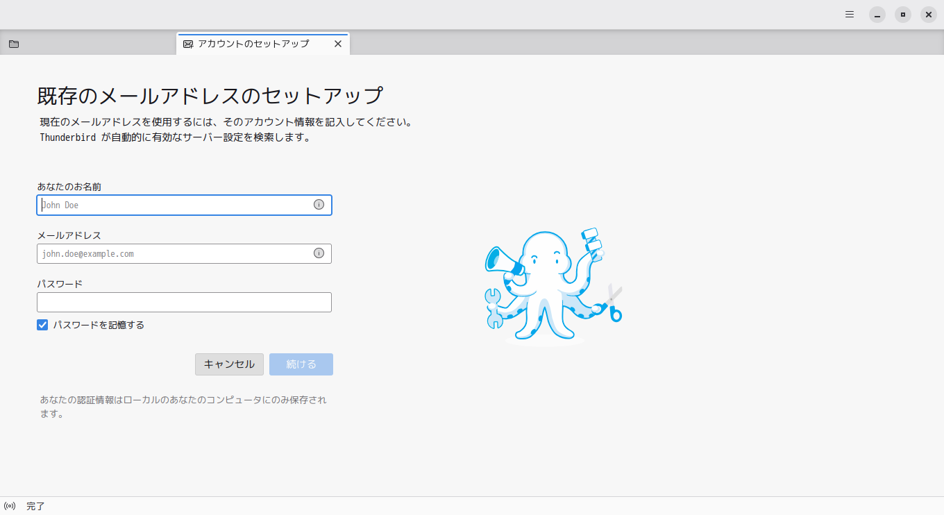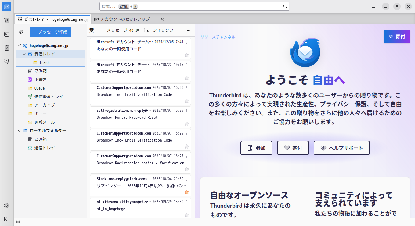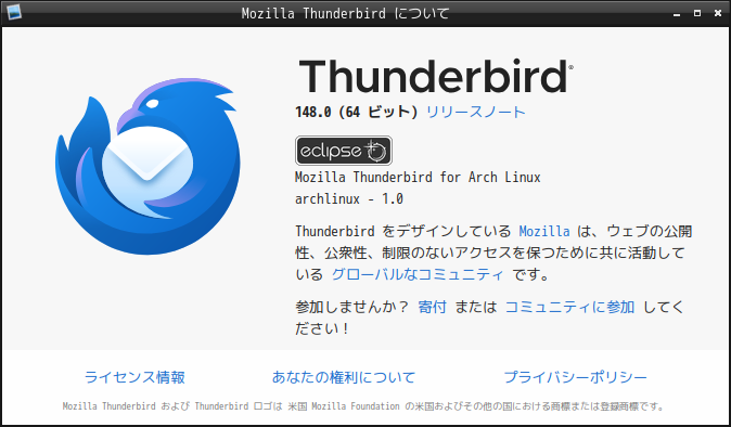 初回起動時は、「アカウント設定」が起動します。 起動直後に、受信ボックスを開いた状態です。 2026年3月12日の時点で、下記のバージョンでした。 操作方法等は「メール クライアント ソフト - Thunderbird」をご参照ください。 |