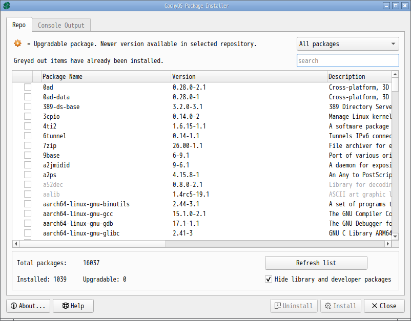 起動直後の状態です。 2026年3月12日の時点で、下記のバージョンでした。 操作方法等は「Linux - 共通事項 - パッケージ管理フロントエンド」をご参照ください。 |