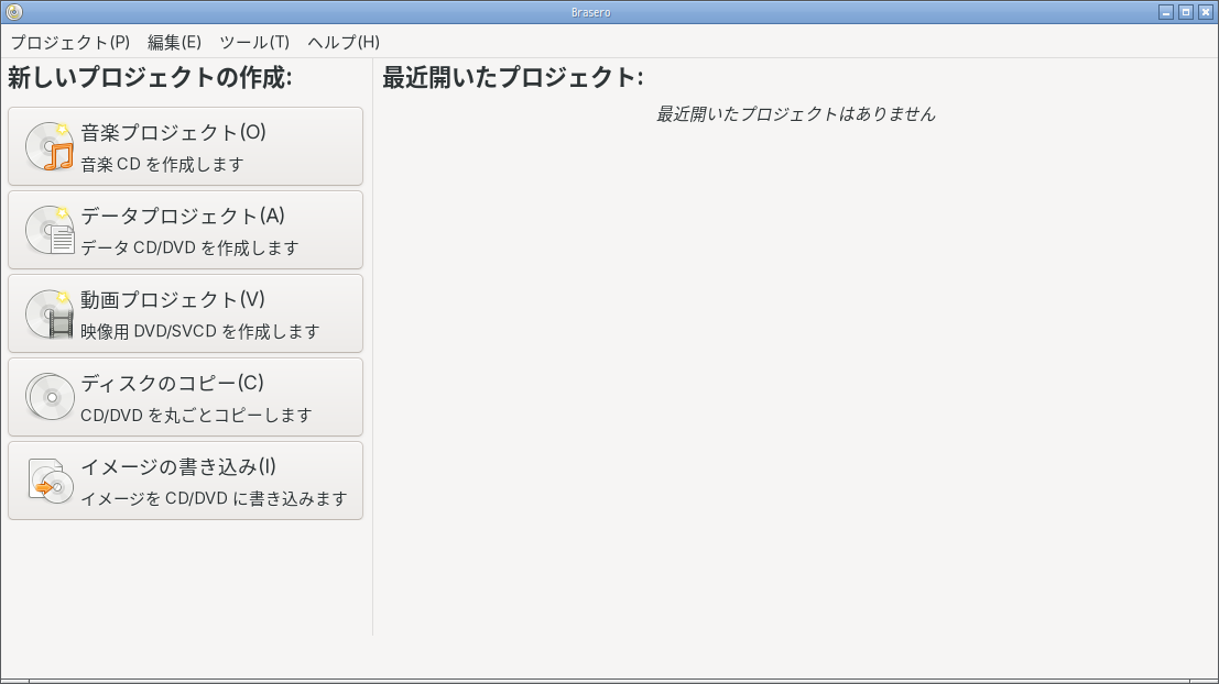 光ディスクライティングソフトとして、「Brasero」を使用します。