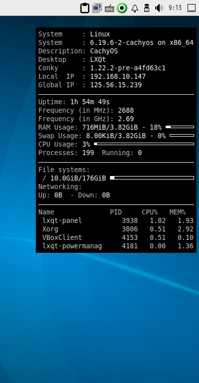 ログイン後、デスクトップ右に、「Conky」の表示が現れます。