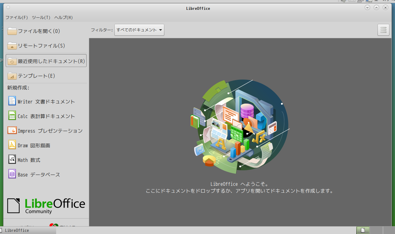 起動直後の状態です。 (どうも「LibreOffice」は、デスクトップからはみ出ちゃうんですよね、フィットして欲しいんだけどな) 2026年3月13日の時点で、下記のバージョンでした。 操作方法等については「オフィススィート LibreOffice」をご参照ください。 |