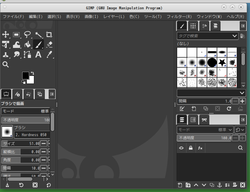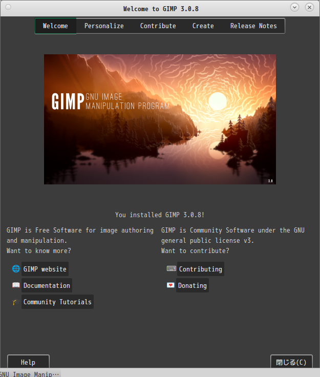 「閉じる」 起動直後の状態です。 2026年3月13日の時点で、下記のバージョンでした。 操作については、「画像編集ソフト - GIMP」に掲載しています。 上記は簡単なものですので、詳細なものがほしい方は、各所に初歩の手引きから応用編までありますので、そちらを参考にしてください。 |