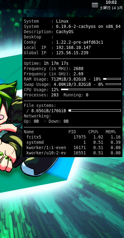 ログイン後、デスクトップ右に、「Conky」の表示が現れます。