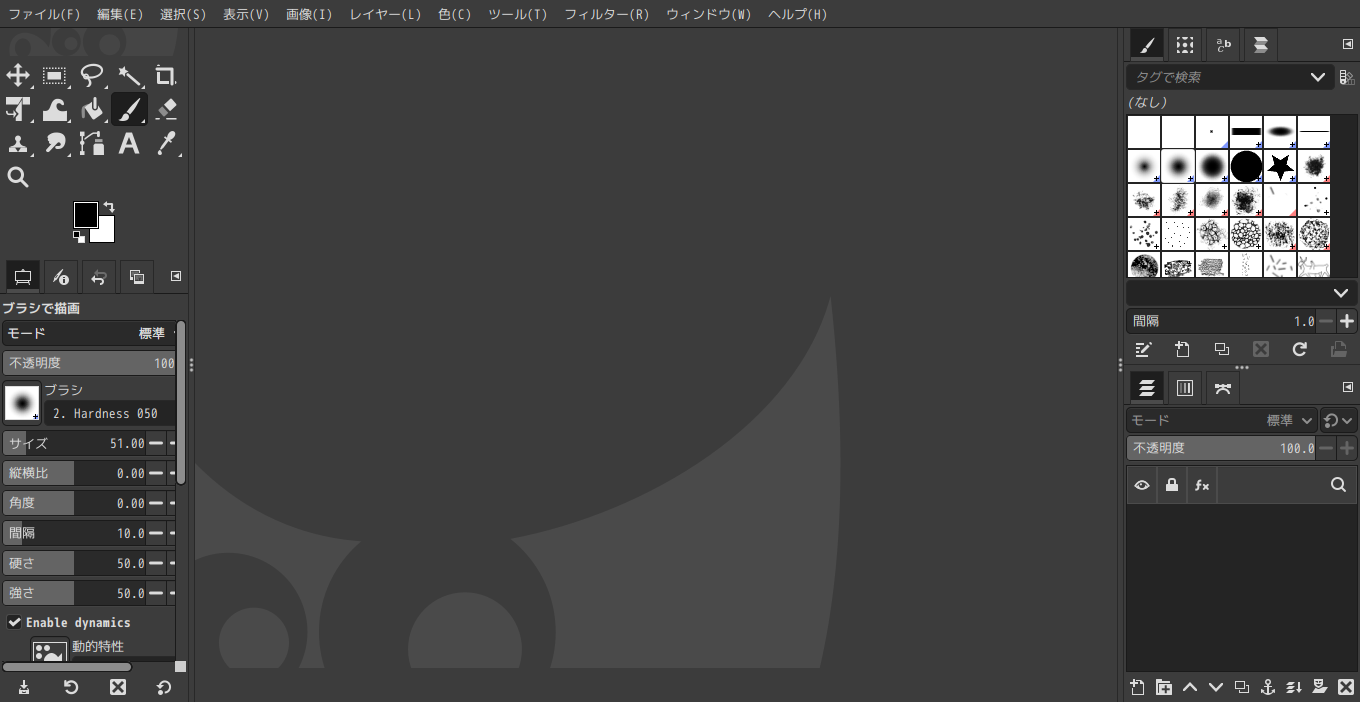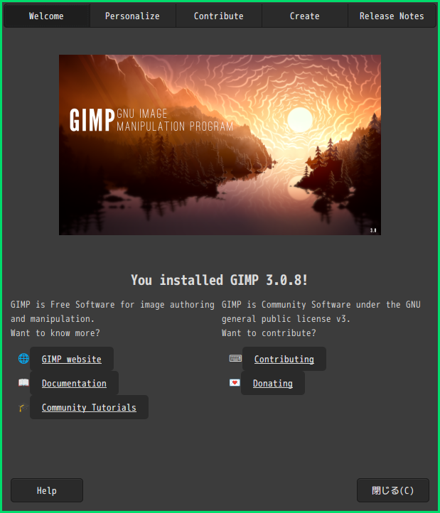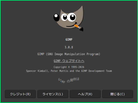 「閉じる」 起動直後の状態です。 2026年3月14日の時点で、下記のバージョンでした。 操作については、「画像編集ソフト - GIMP」に掲載しています。 上記は簡単なものですので、詳細なものがほしい方は、各所に初歩の手引きから応用編までありますので、そちらを参考にしてください。 |