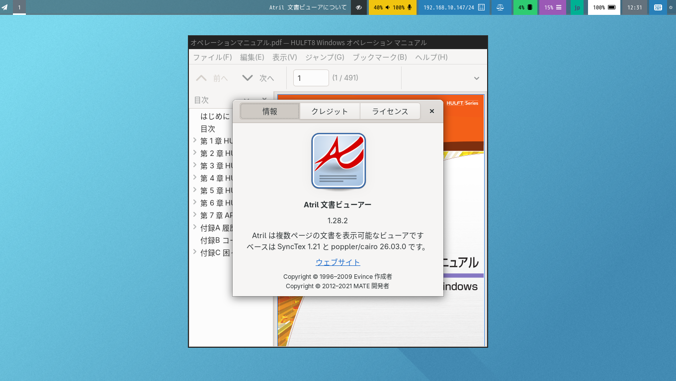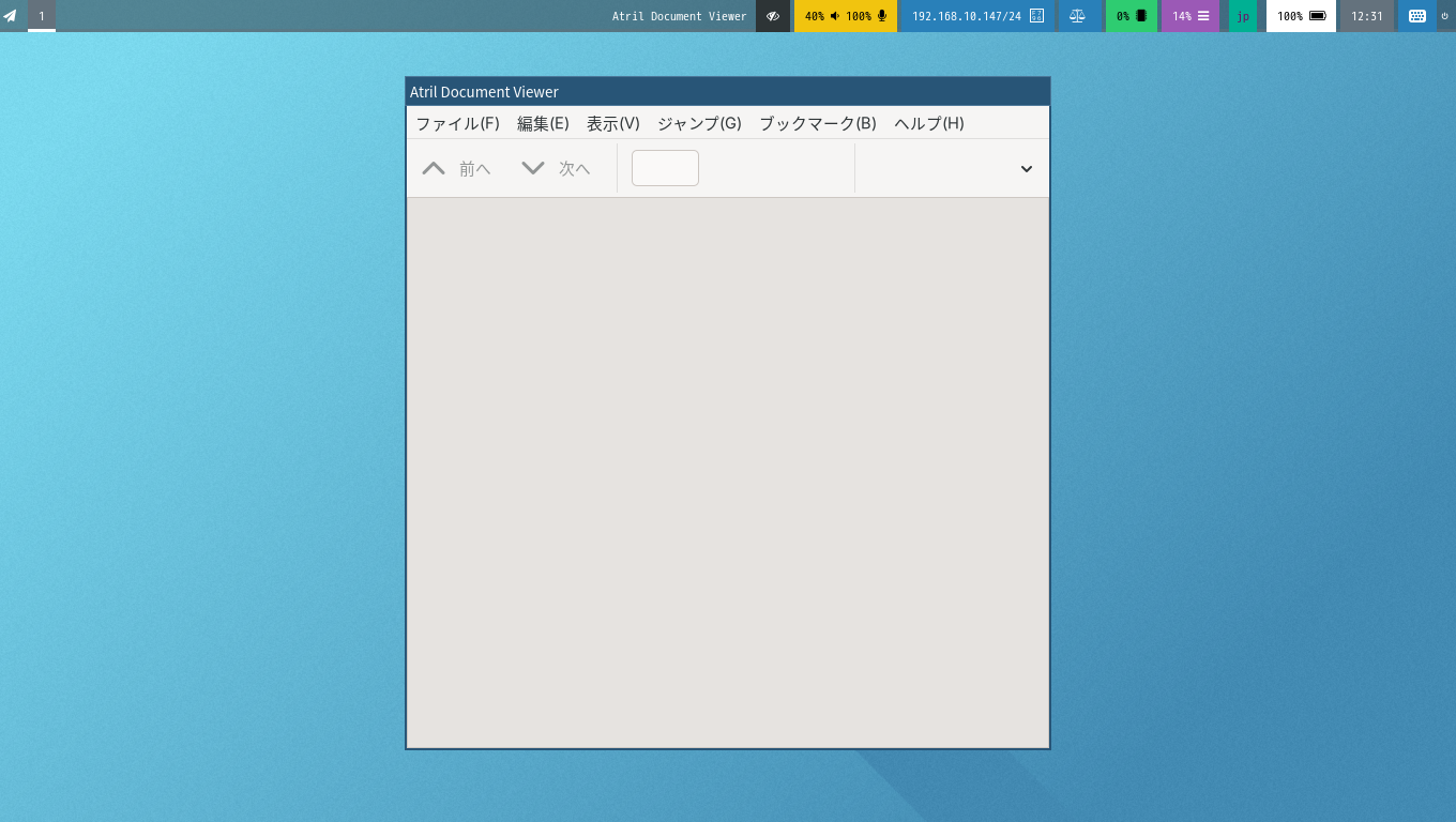 1. 概要 ドキュメントビューアとして、「Atril」を使用します。 「Atril」は、デフォルトでインストールされています。 2. インストール 「root」ユーザ権限で。 yes | pacman -S atril 3. 起動 「スタート」→「オフィス」→「Atril 文書ビューア」