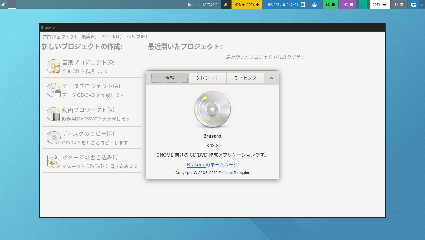 1. 概要 光ディスクライティングソフトとして、「Brasero」を使用します。 2. インストール 「root」ユーザ権限で。 yes | pacman -S brasero 3. 起動 「スタート」→「サウンドとビデオ」→「Brasero」