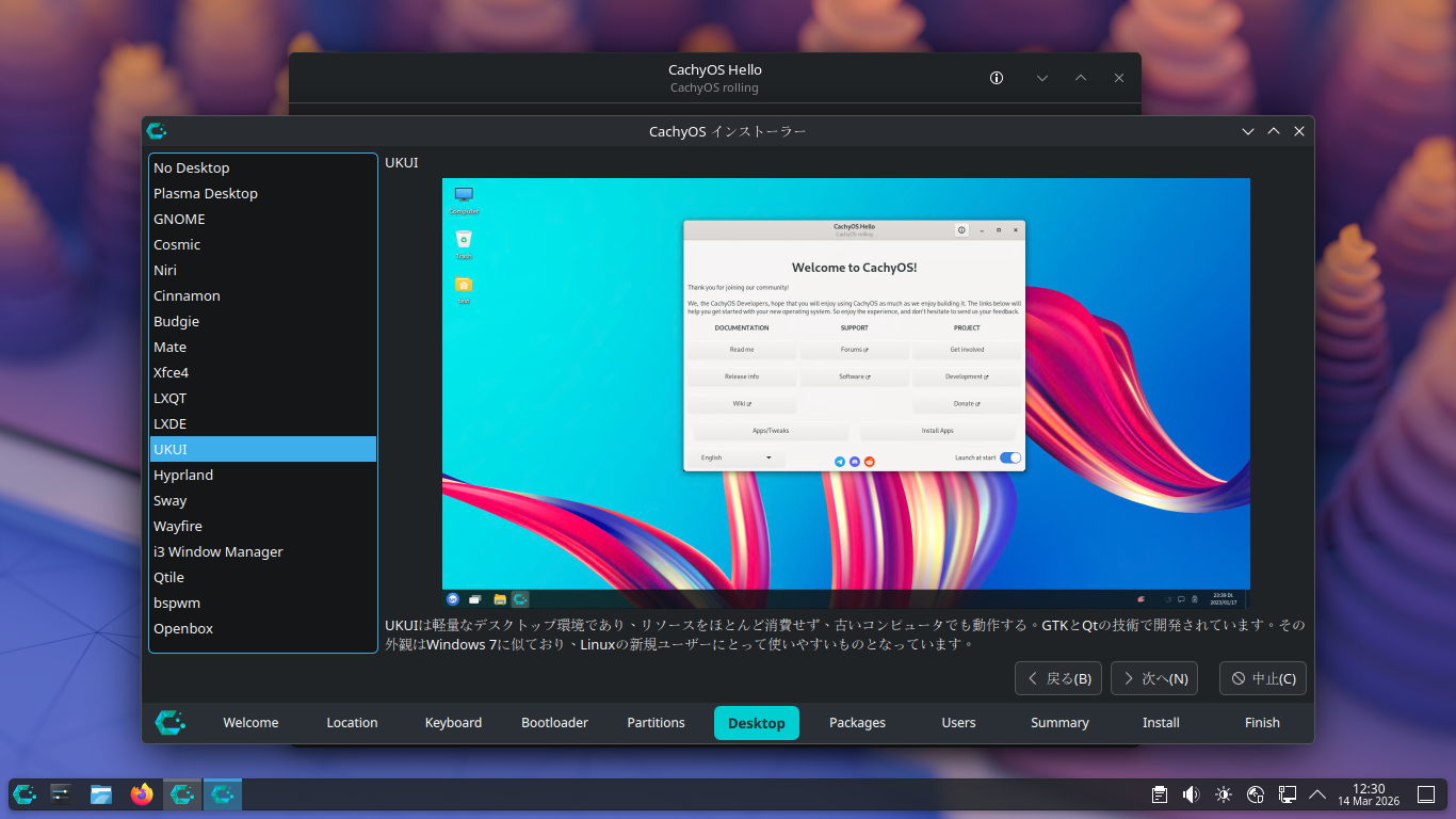 1. 概要 インストールに関しては、「CachyOS - 260308 - 共通事項」をご参照ください。 2. インストール インストール時に、デスクトップ選択画面で、「UKUI」を選択します。