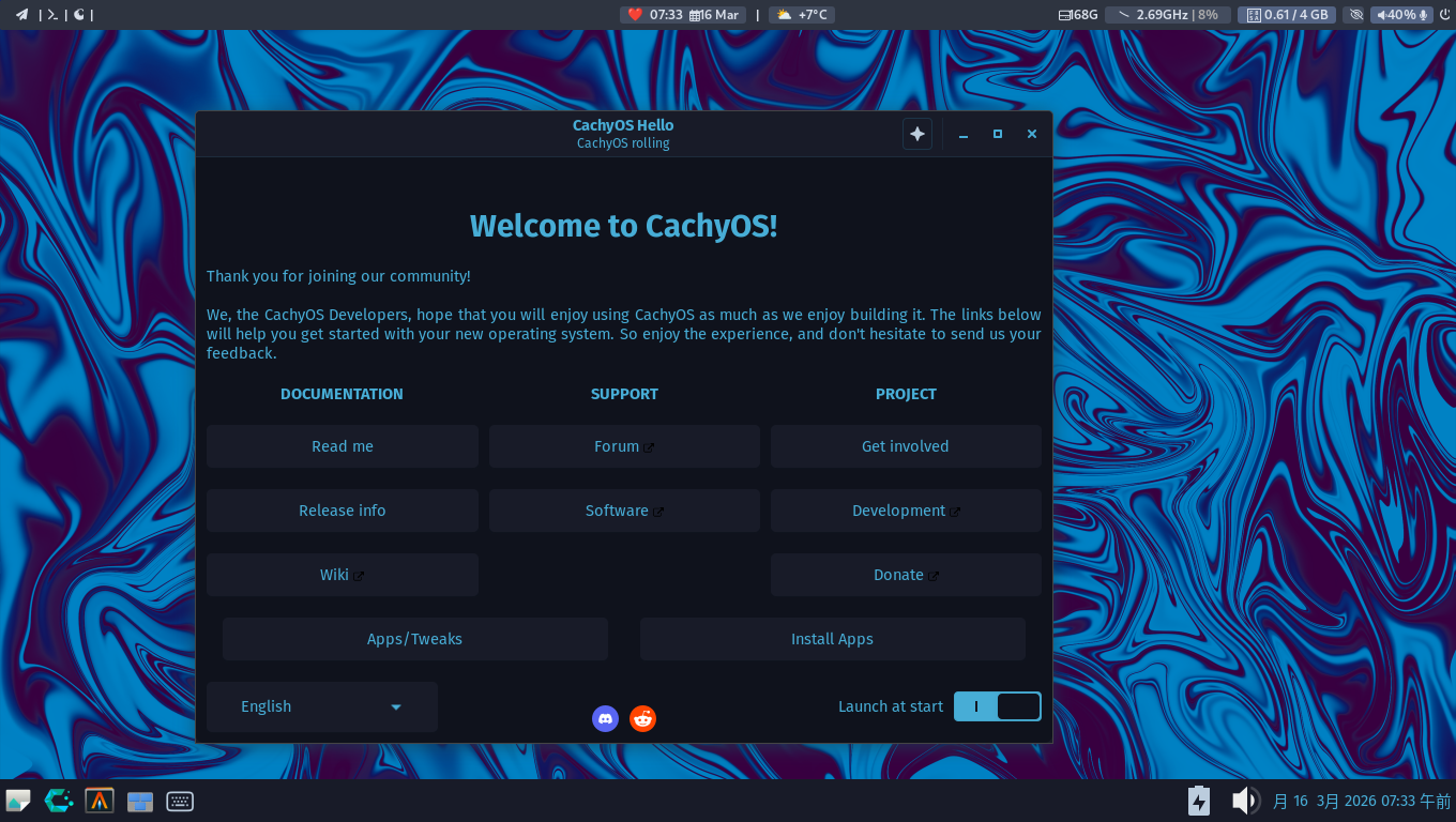 ログインするたびに「CachyOS Hello」というダイアログが表示されます。