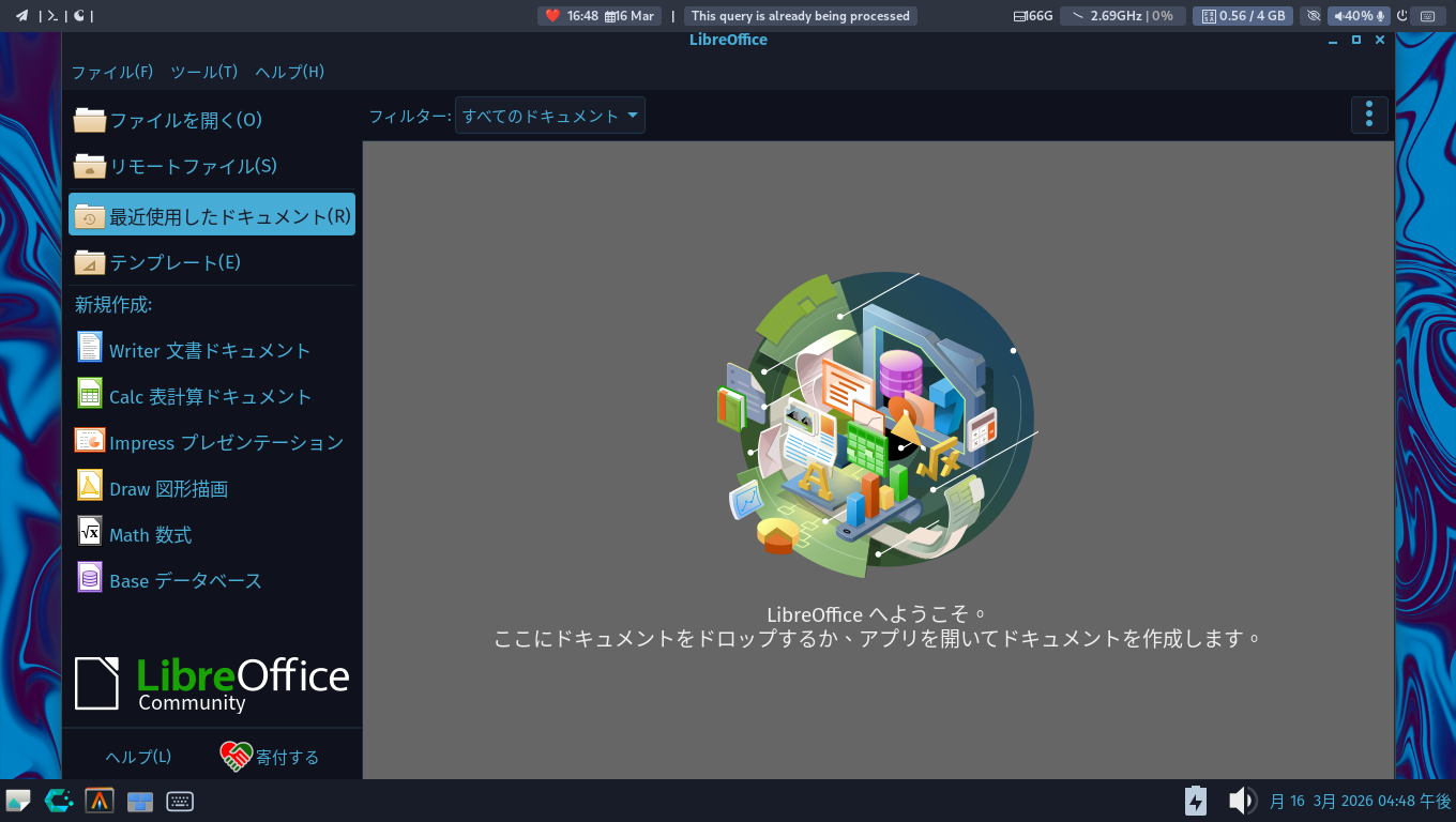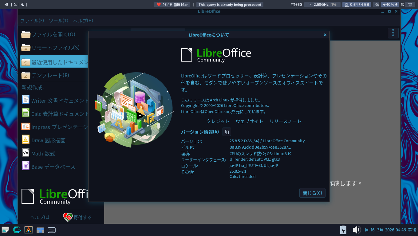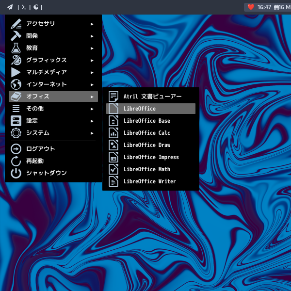 1. 概要 オフィススイートとして、「LibreOffice」を使用します。 2. インストール 「Octopi」で、「libreoffice-ja」を検索して、「libreoffice-still-ja」をインストールします。 3. 起動 「スタート」→「オフィス」→「LibreOffice」