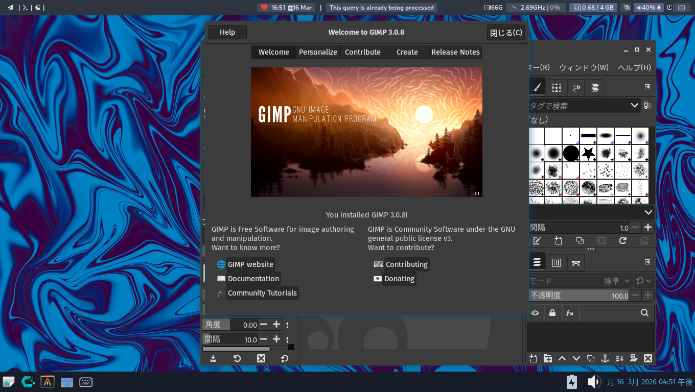 「閉じる」 起動直後の状態です。 2026年3月16日の時点で、下記のバージョンでした。 操作については、「画像編集ソフト - GIMP」に掲載しています。 上記は簡単なものですので、詳細なものがほしい方は、各所に初歩の手引きから応用編までありますので、そちらを参考にしてください。 |