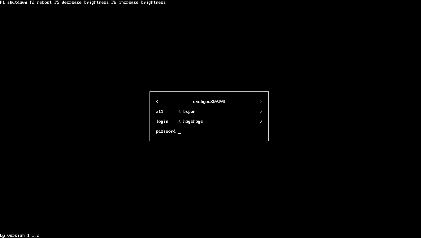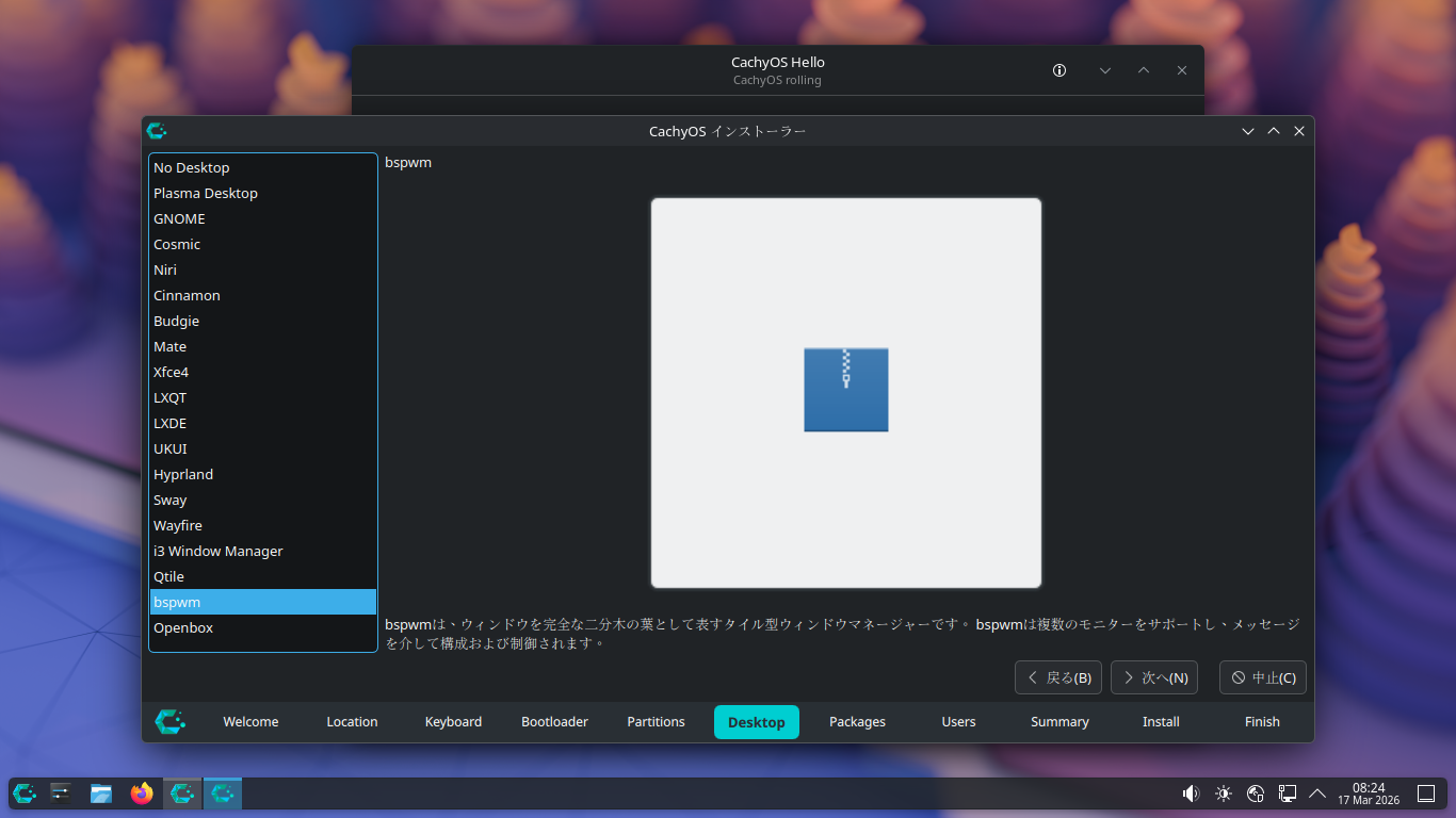 1. 概要 インストール手順の詳細に関しては、「CachyOS - 260308 - 共通事項」をご参照ください。 2. インストール インストール時に、デスクトップ選択画面で、「bspwm」を選択します。