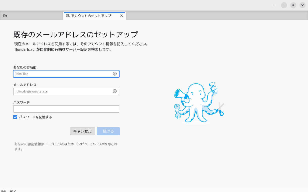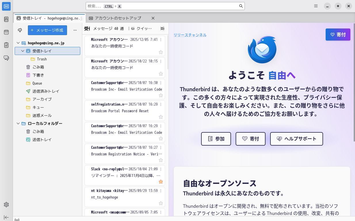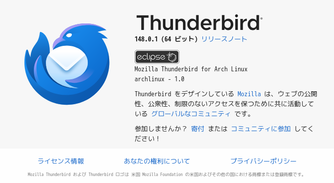 初回起動時は、「アカウント設定」が起動します。 起動直後に、受信ボックスを開いた状態です。 2026年3月17日の時点で、下記のバージョンでした。 操作方法等は「メール クライアント ソフト - Thunderbird」をご参照ください。 |