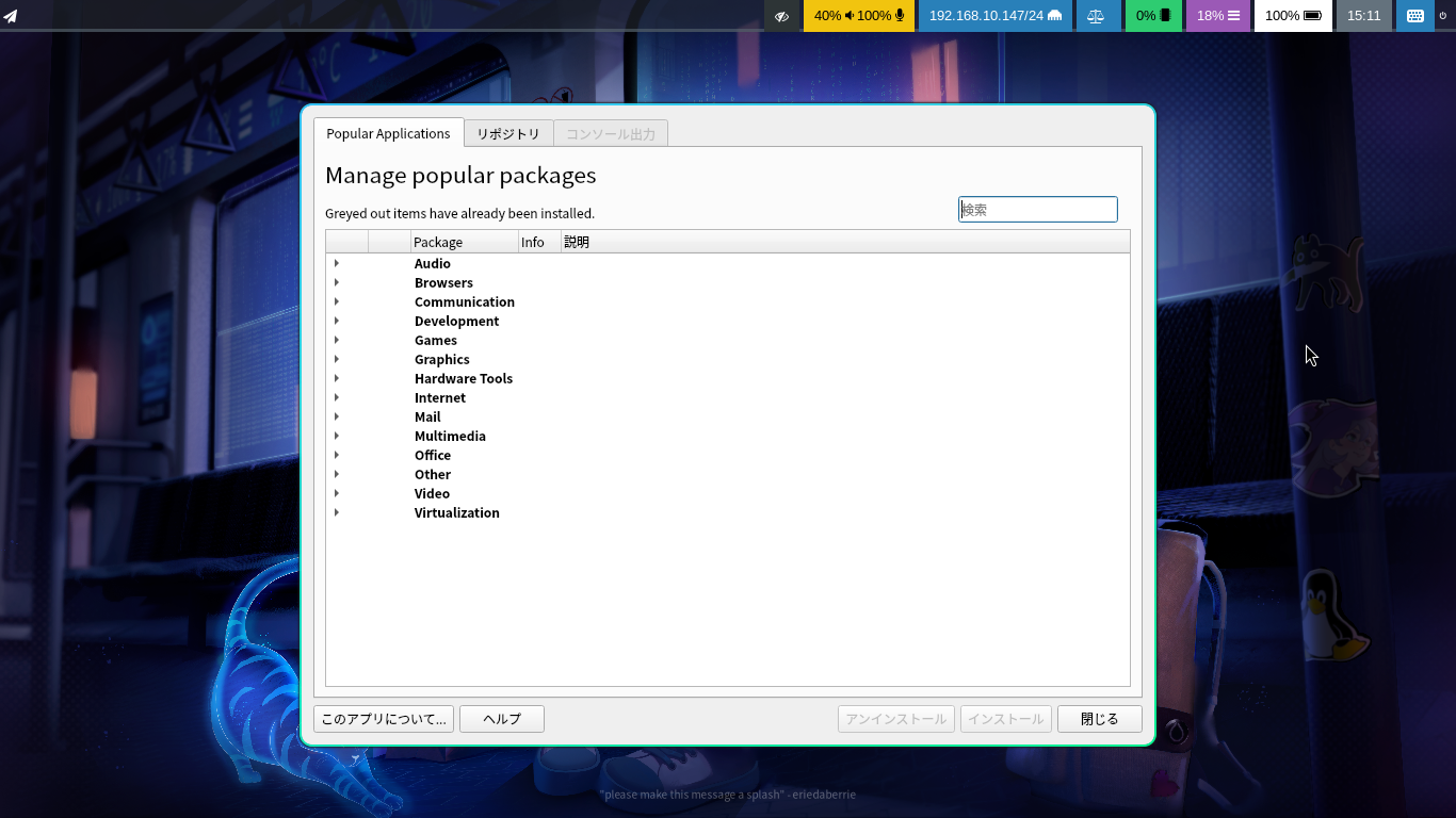 起動直後の状態です。 2026年3月17日の時点で、下記のバージョンでした。 操作方法等は「Linux - 共通事項 - パッケージ管理フロントエンド」をご参照ください。 |