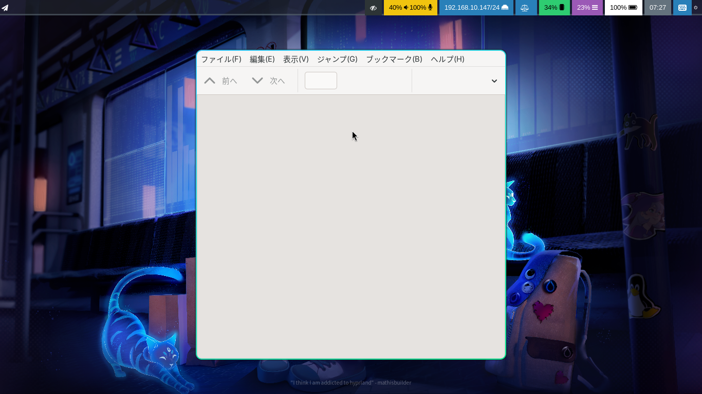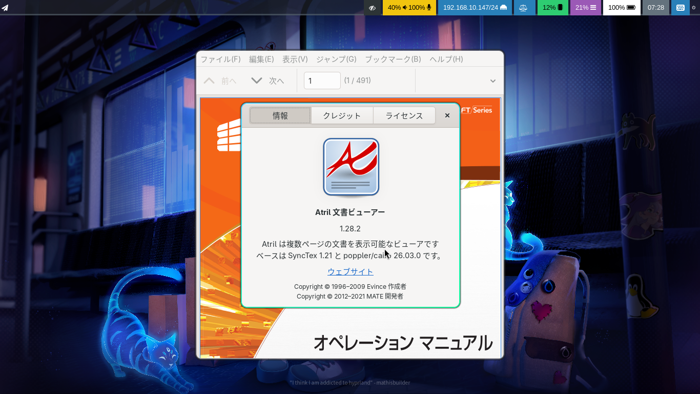 1. 概要 ドキュメントビューアとして、「Atril」を使用します。 2. インストール 「root」ユーザ権限で。 yes | pacman -S atril 3. 起動 「スタート」→「オフィス」→「Atril 文書ビューア」