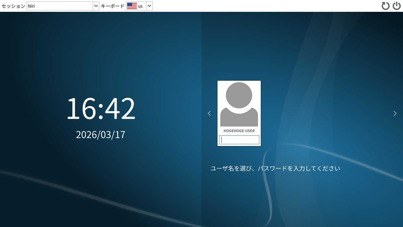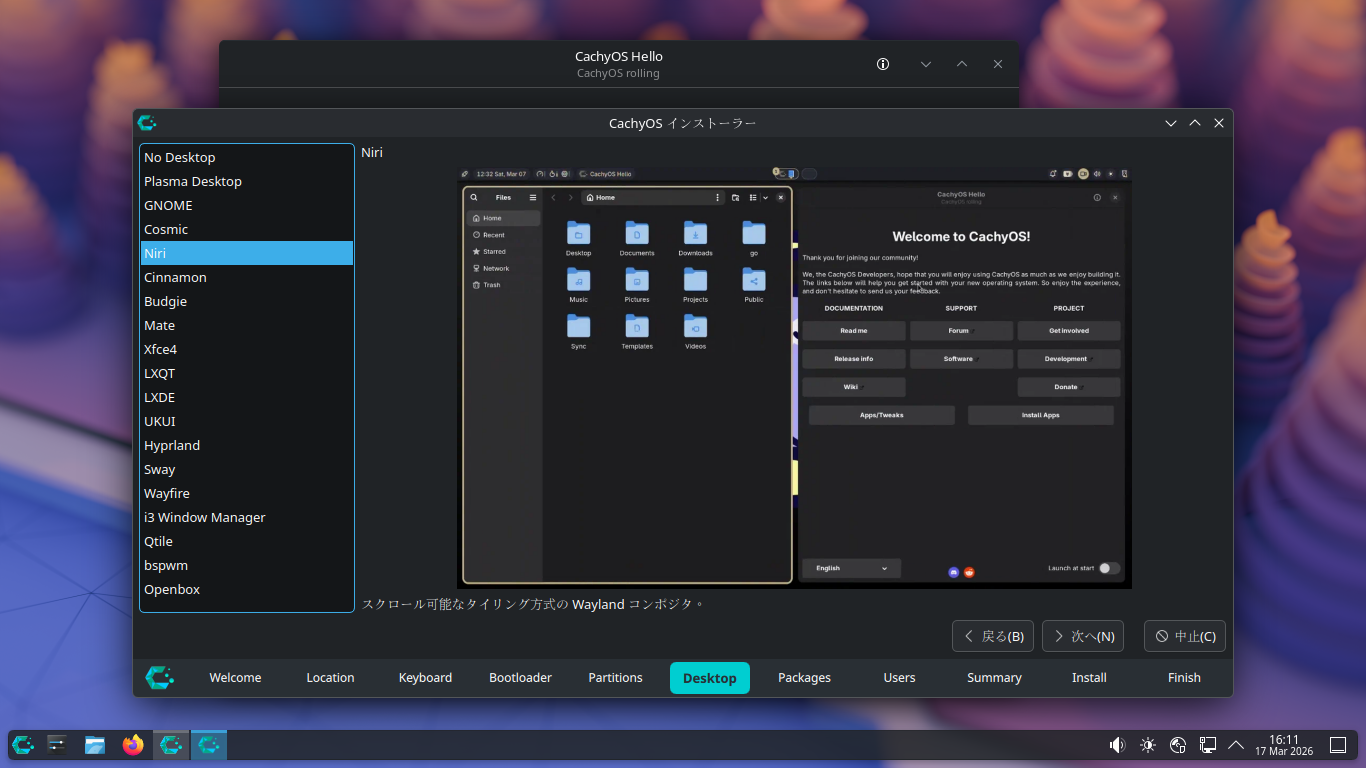 1. 概要 インストールに関しては、「CachyOS - 260308 - 共通事項」をご参照ください。 2. インストール インストール時に、デスクトップ選択画面で、「niri」を選択します。