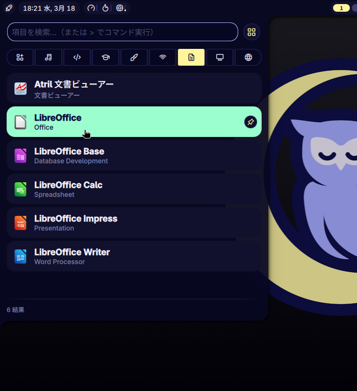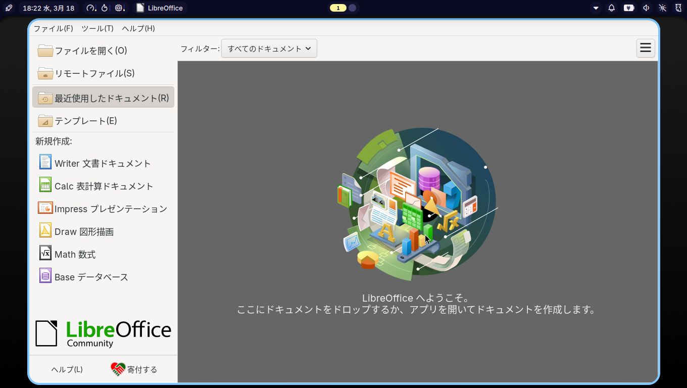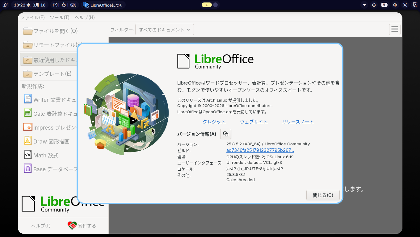 1. 概要 オフィススイートとして、「LibreOffice」を使用します。 2. インストール 「Octopi」で、「libreoffice-ja」を検索して、「libreoffice-still-ja」をインストールします。 3. 起動 「スタート」→「オフィス」→「LibreOffice」