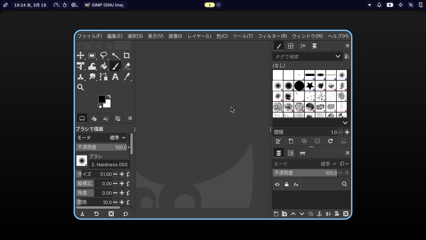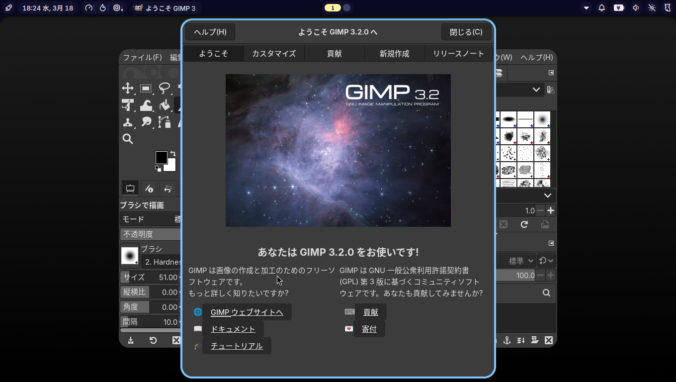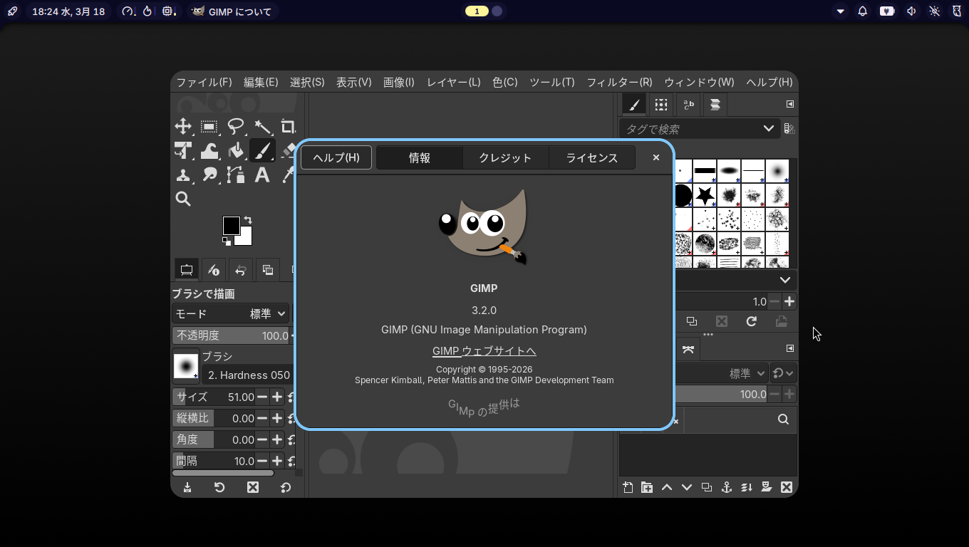 「閉じる」 起動直後の状態です。 2026年3月18日の時点で、下記のバージョンでした。 操作については、「画像編集ソフト - GIMP」に掲載しています。 上記は簡単なものですので、詳細なものがほしい方は、各所に初歩の手引きから応用編までありますので、そちらを参考にしてください。 |