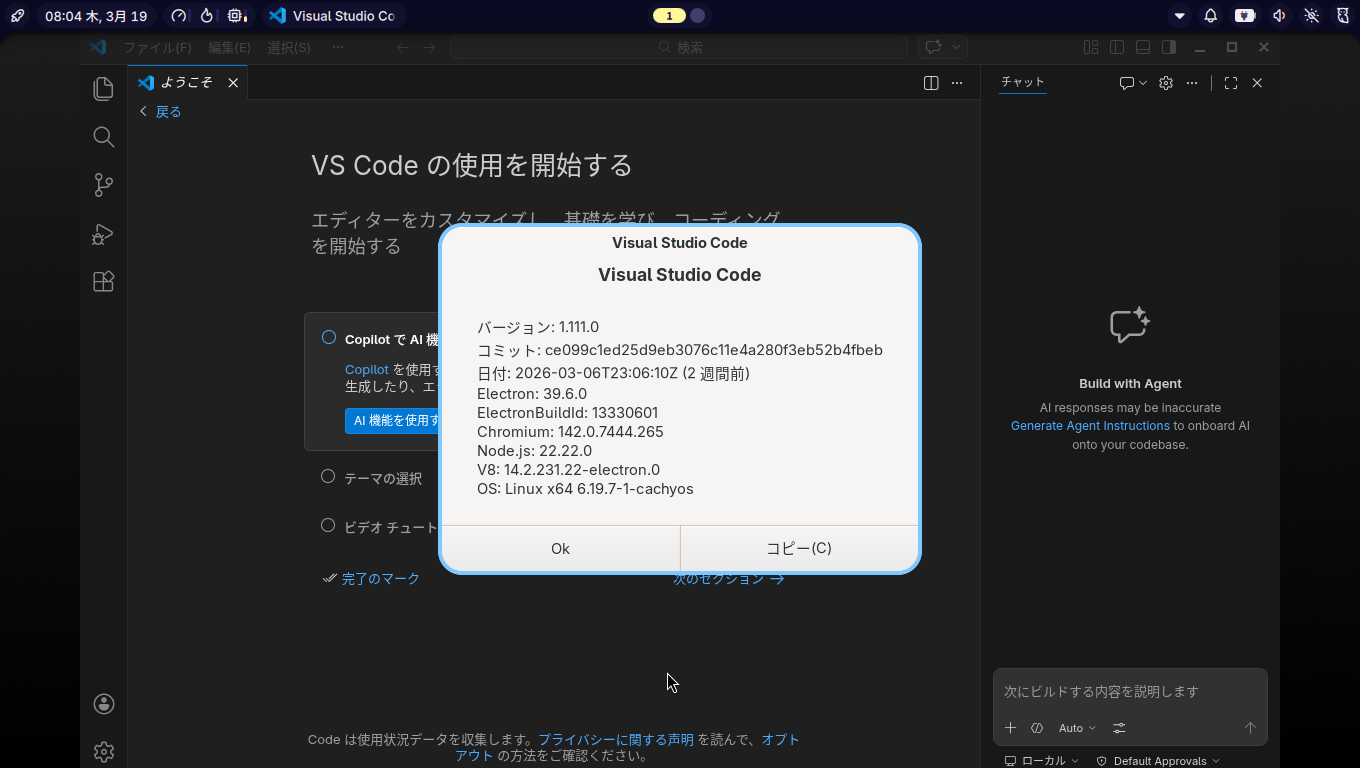 1. 概要 開発環境として、「Visual Studio Code」を使用します。 2. インストール ログインユーザで。 yay -S visual-studio-code-bin 複数回、Enter の入力が必要です。 3. 起動 「スタート」→「開発」→「Visual Studio Code」