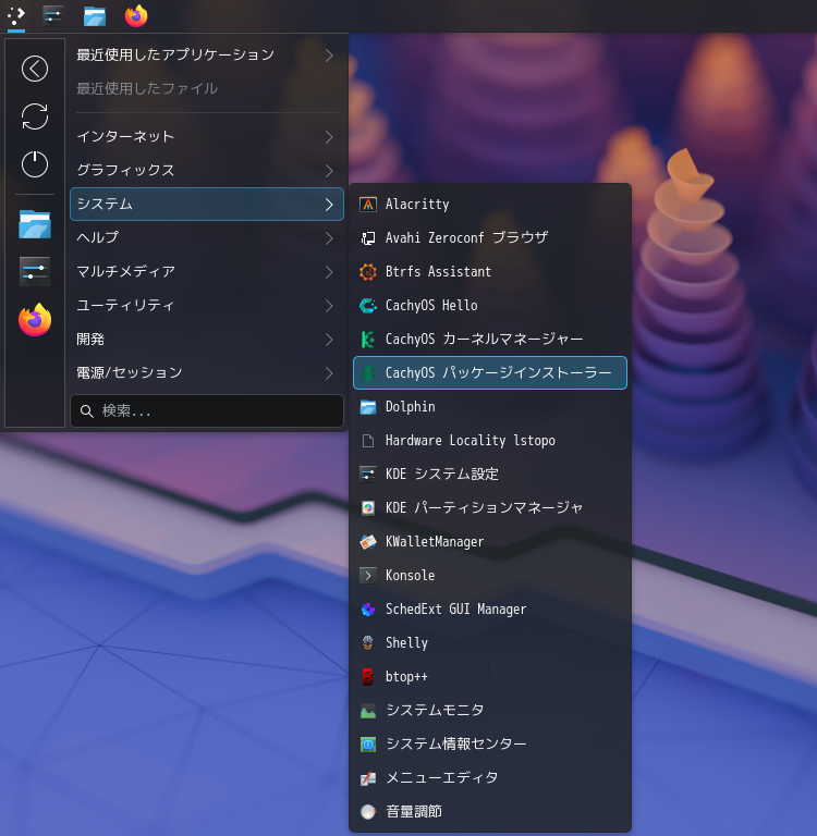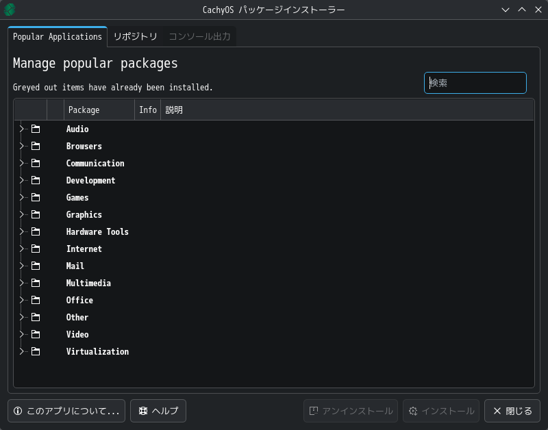 1. 概要 パッケージ管理フロントエンドとして「CachyOS Package Installer」がデフォルトでインストールされています。 2. CachyOS Package Installer 「スタート」→「システム」→「CachyOS パッケージインストーラ」