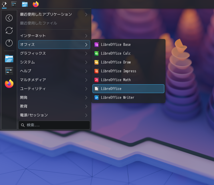 1. 概要 オフィススイートとして、「LibreOffice」を使用します。 2. インストール 「Octopi」で、「libreoffice-ja」を検索して、「libreoffice-still-ja」をインストールします。 3. 起動 「スタート」→「オフィス」→「LibreOffice」