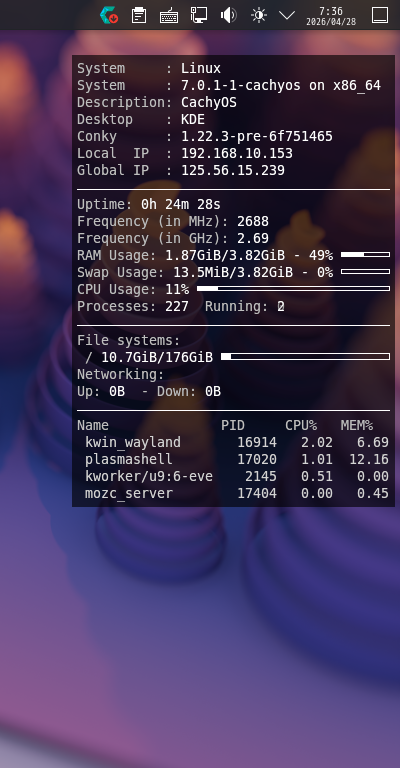 ログイン後、デスクトップ右に、「Conky」の表示が現れます。