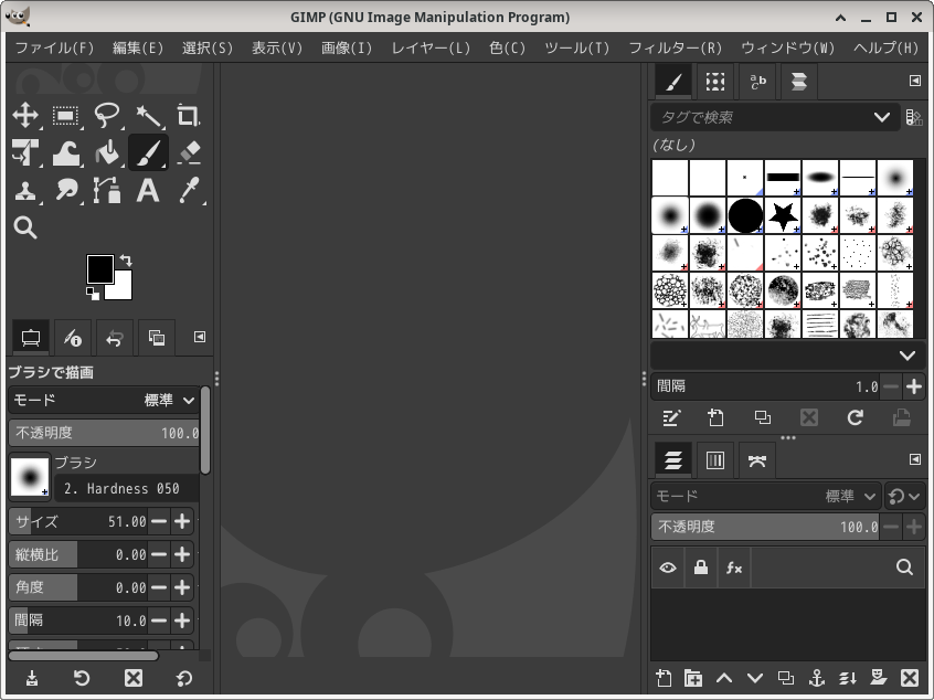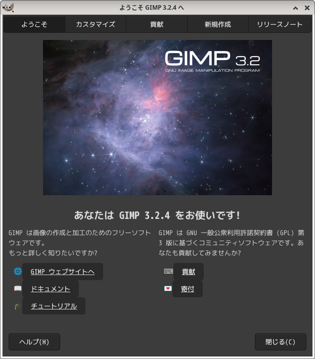 「閉じる」 起動直後の状態です。 2026年4月28日の時点で、下記のバージョンでした。 操作については、「画像編集ソフト - GIMP」に掲載しています。 上記は簡単なものですので、詳細なものがほしい方は、各所に初歩の手引きから応用編までありますので、そちらを参考にしてください。 |