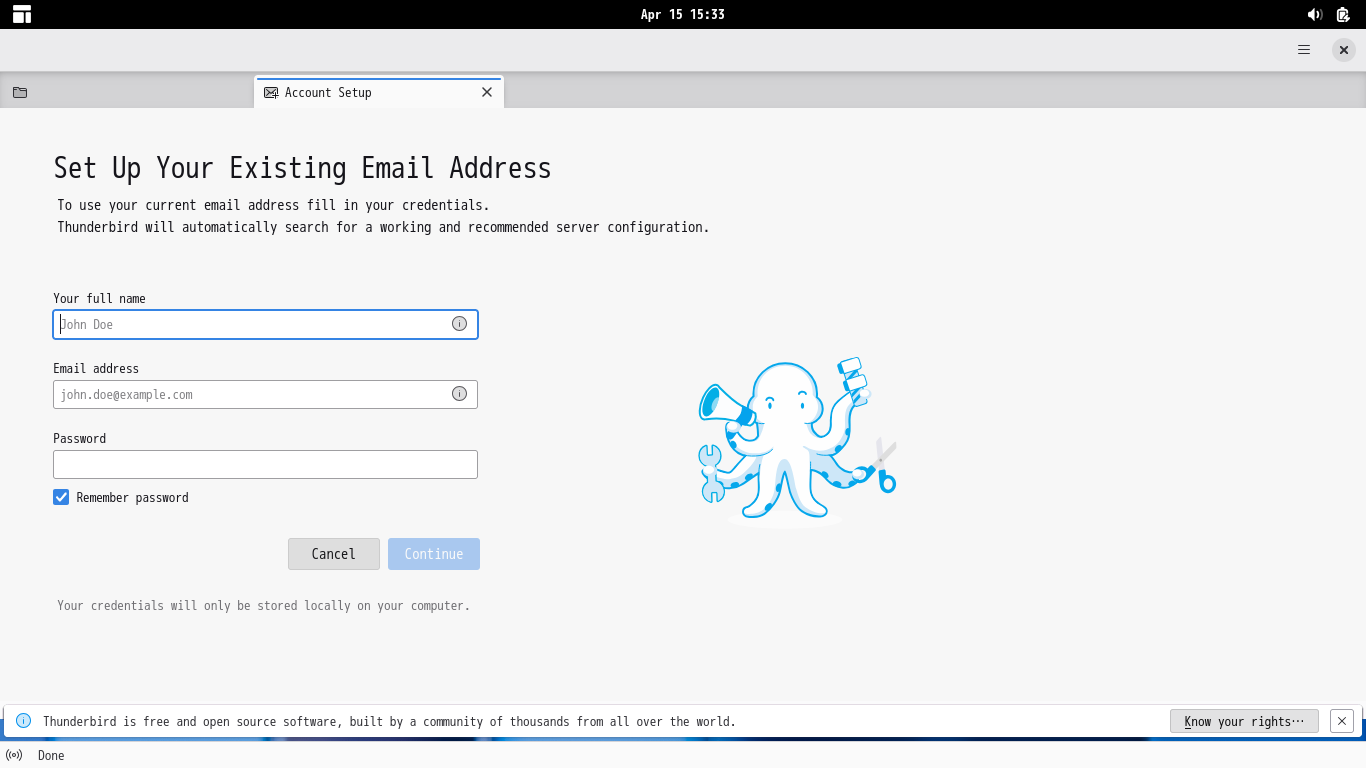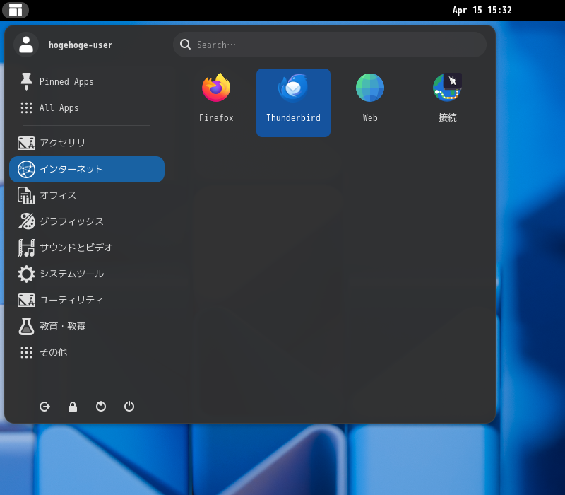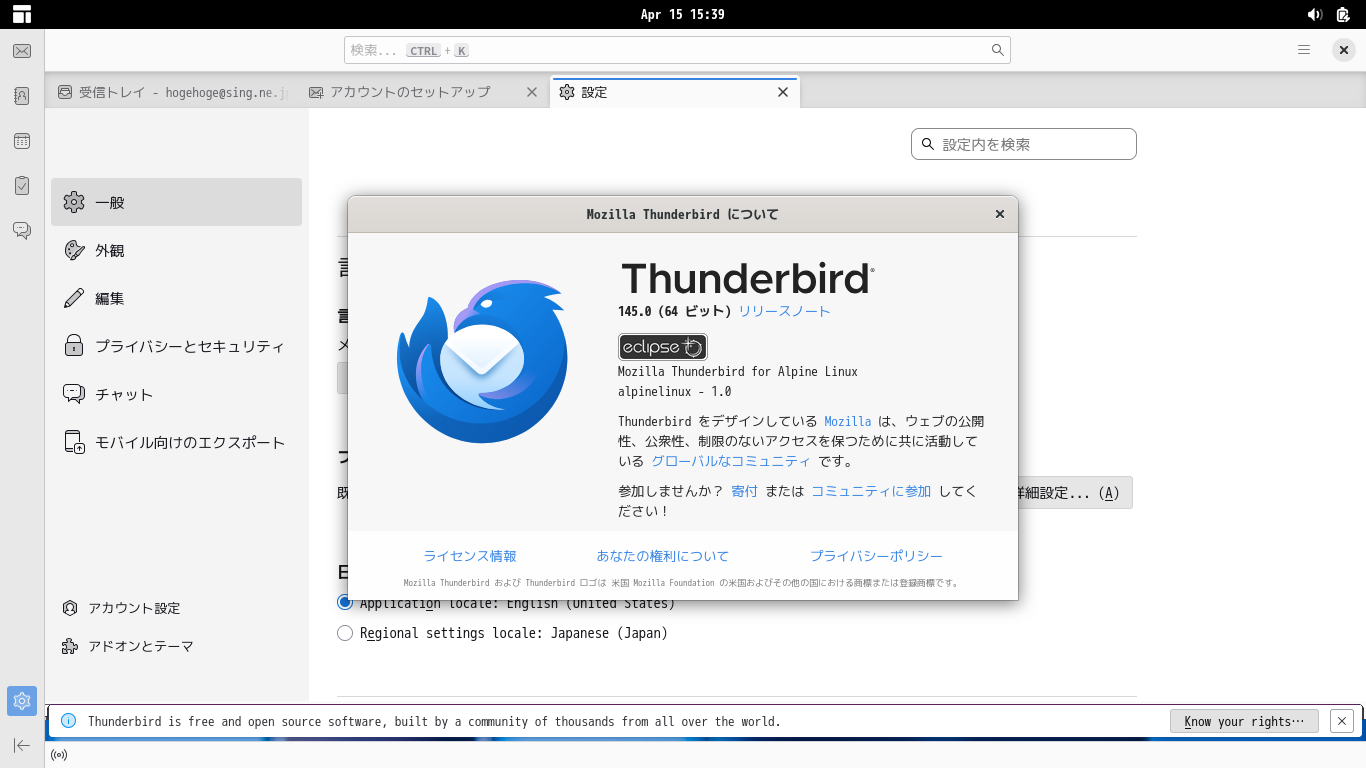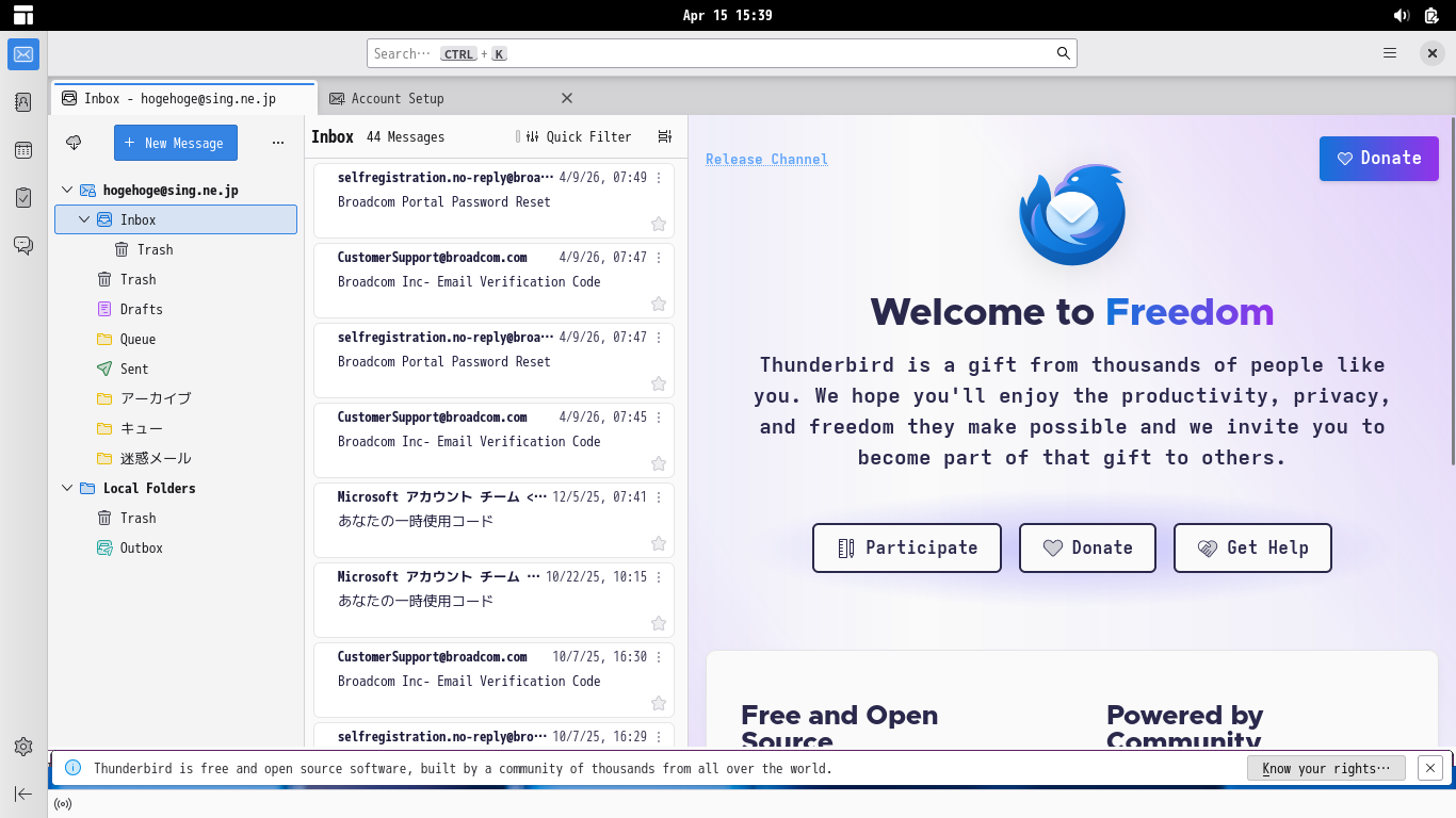 初回起動時は、「アカウント設定」が起動します。 起動直後に、受信ボックスを開いた状態です。 2026年4月15日の時点で、下記のバージョンでした。 「アカウント設定」「日本語化」他、操作方法等は「メール クライアント ソフト - Thunderbird」をご参照ください。 |