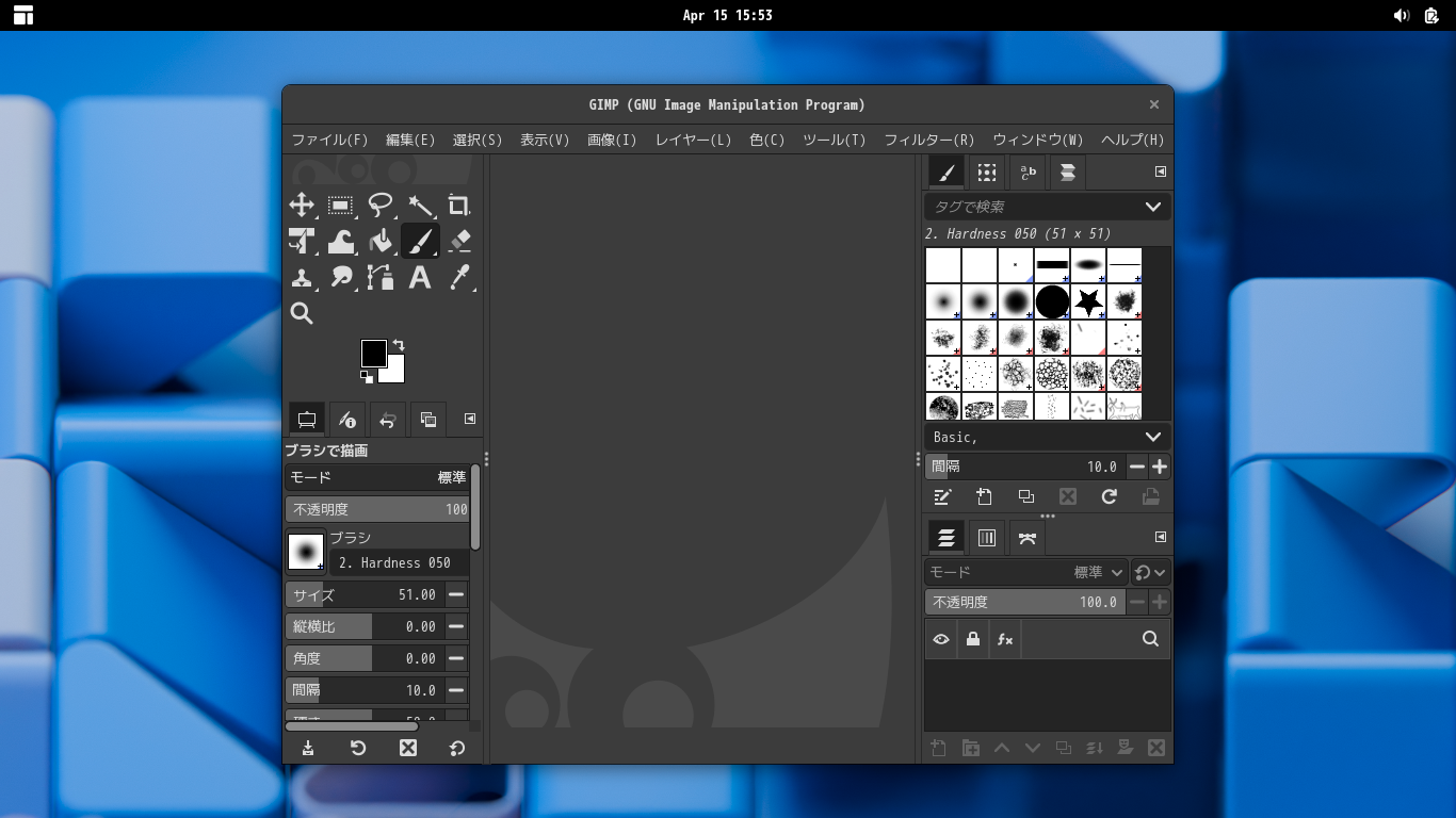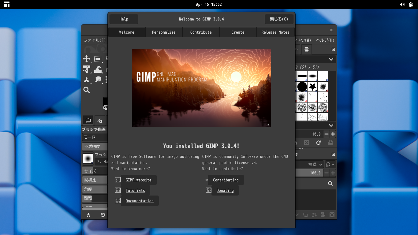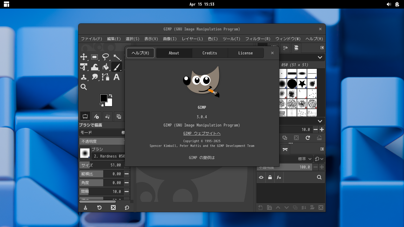 「閉じる」 起動直後の状態です。 2026年4月15日の時点で、下記のバージョンでした。 操作については、「画像編集ソフト - GIMP」に掲載しています。 上記は簡単なものですので、詳細なものがほしい方は、各所に初歩の手引きから応用編までありますので、そちらを参考にしてください。 |