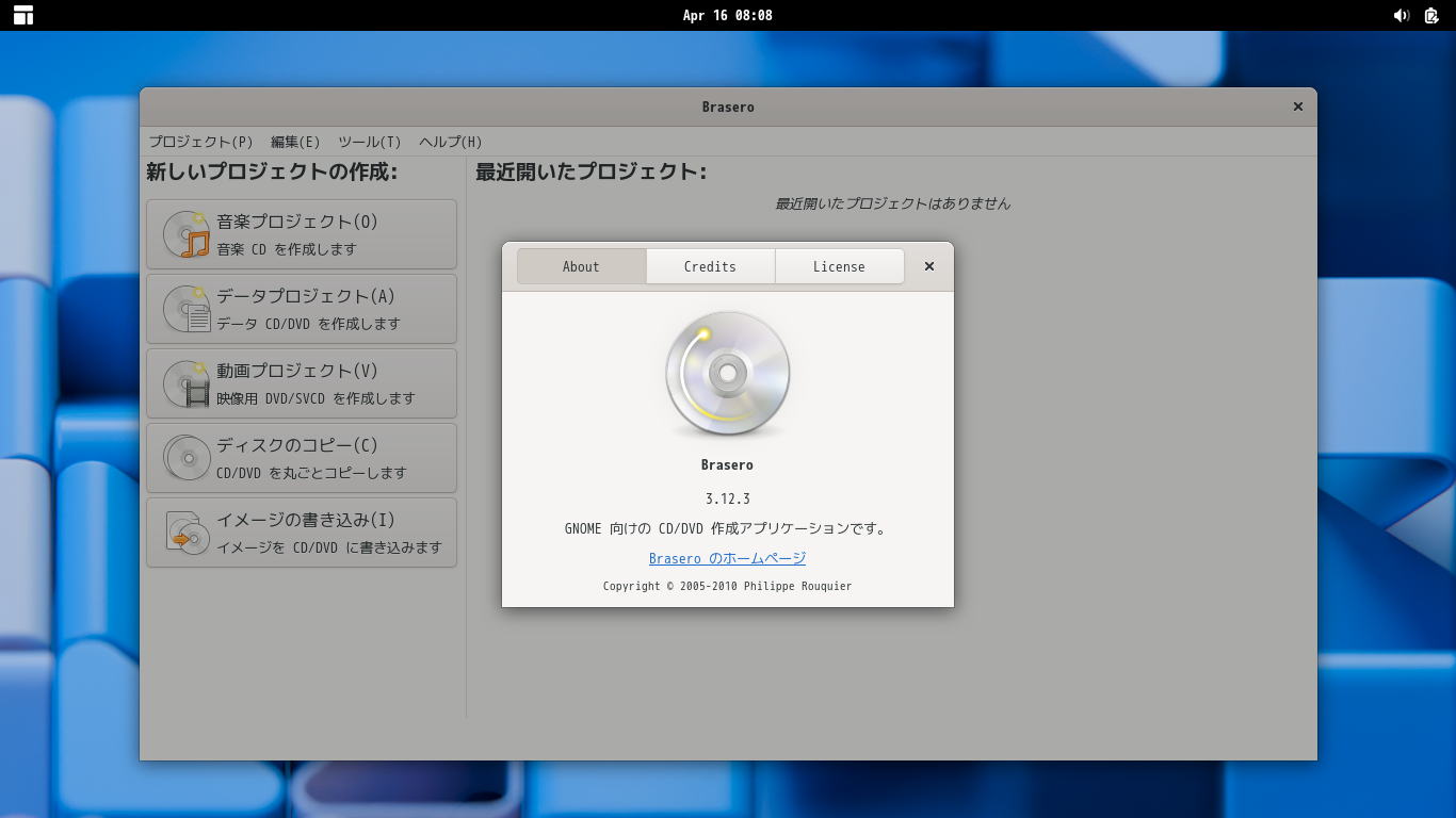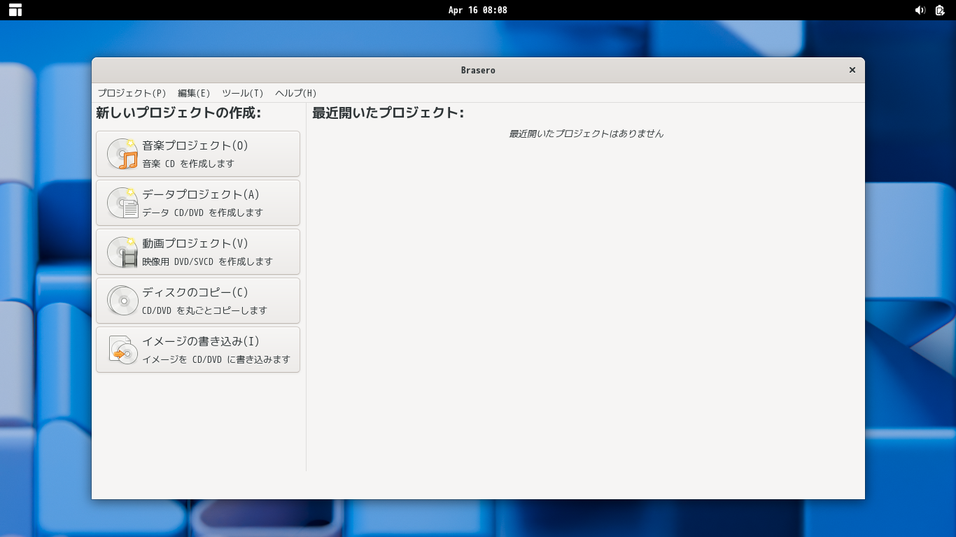 1. 概要 光ディスクライティングソフトとして、「Brasero」を使用します。 2. インストール 「root」ユーザ権限で。 apk add brasero brasero-lang 3. 起動 「スタート」→「サウンドとビデオ」→「Brasero」