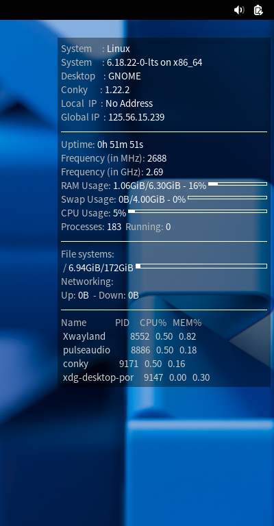 ログイン後、デスクトップ右に、「Conky」の表示が現れます。