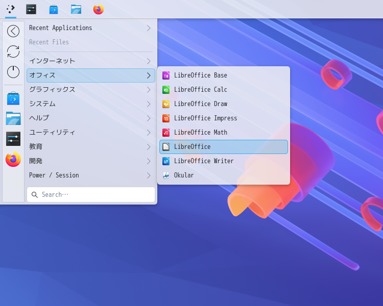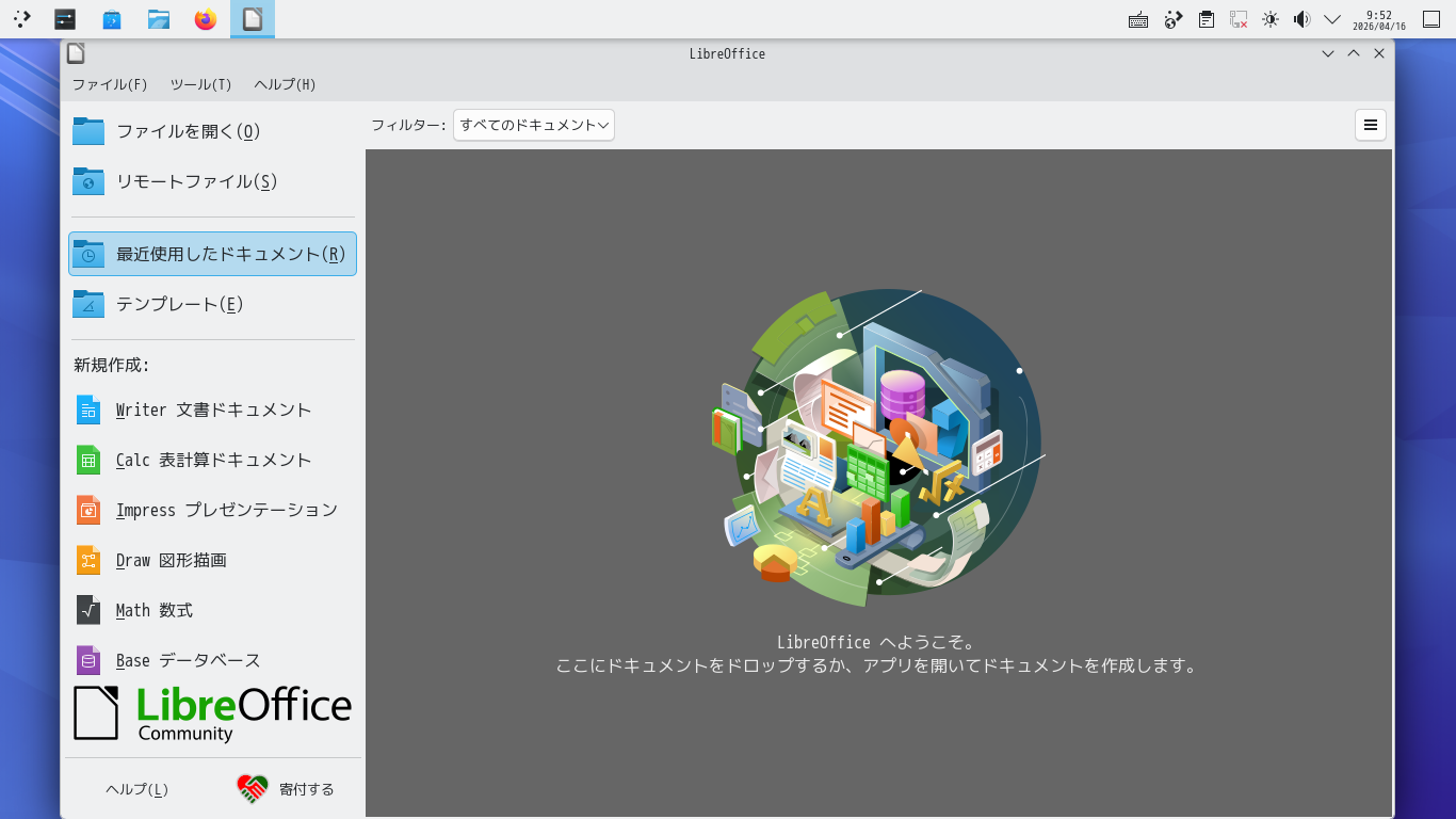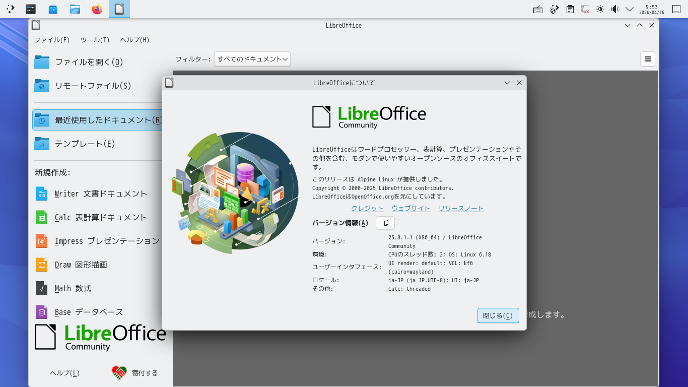 1. 概要 オフィススイートとして、「LibreOffice」を使用します。 2. インストール 「root」ユーザ権限で。 apk add libreoffice libreoffice-lang-ja 3. 起動 「スタート」→「オフィス」→「LibreOffice」
