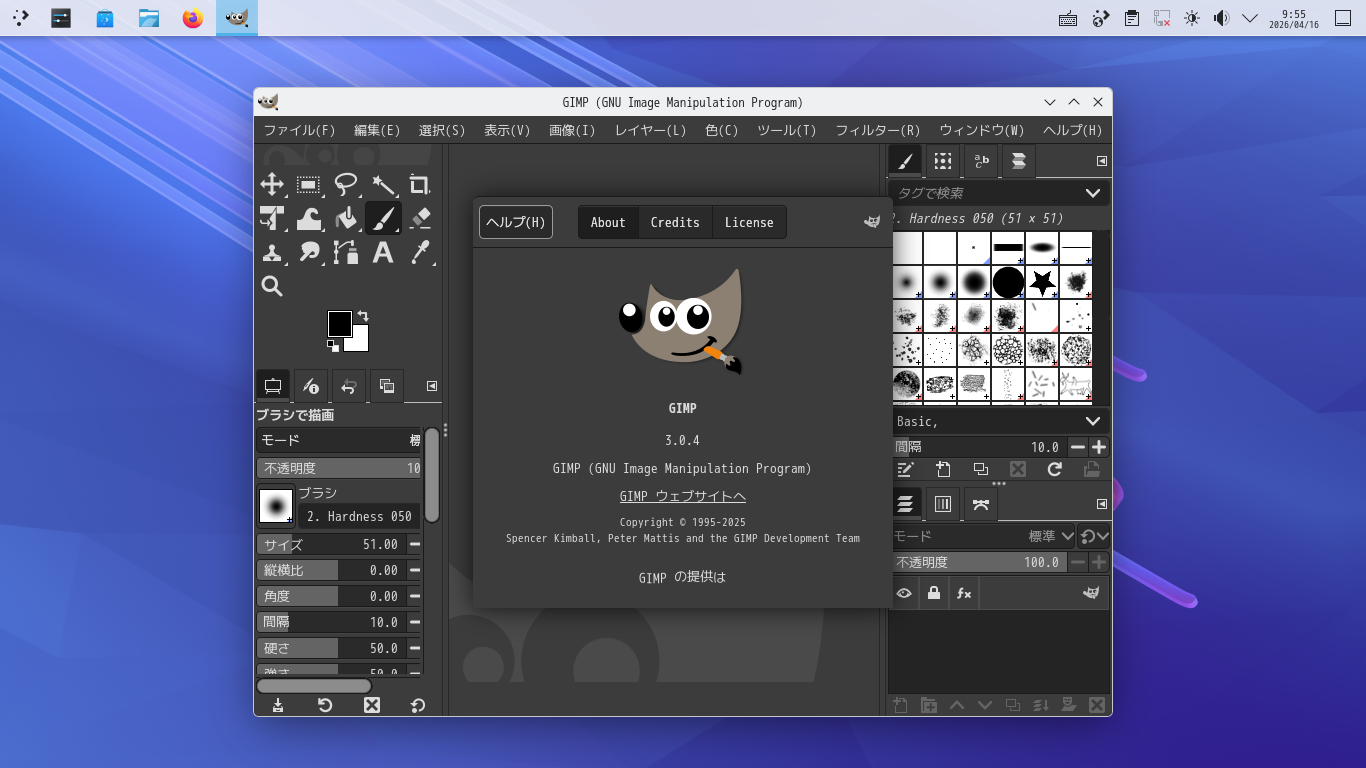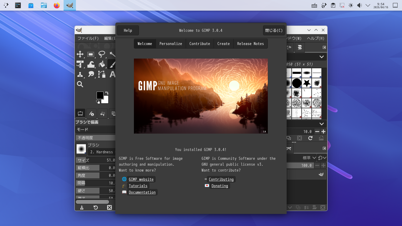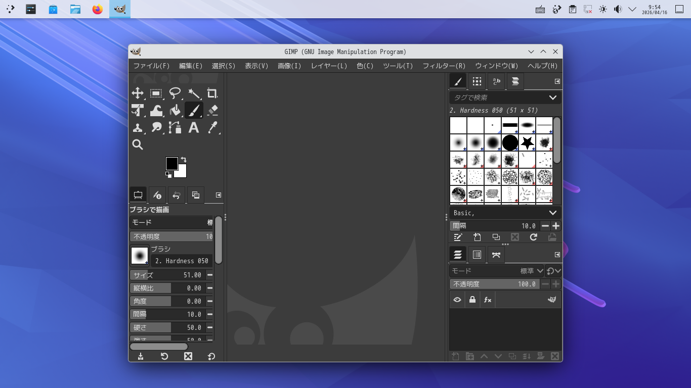 「閉じる」 起動直後の状態です。 2026年4月16日の時点で、下記のバージョンでした。 操作については、「画像編集ソフト - GIMP」に掲載しています。 上記は簡単なものですので、詳細なものがほしい方は、各所に初歩の手引きから応用編までありますので、そちらを参考にしてください。 |