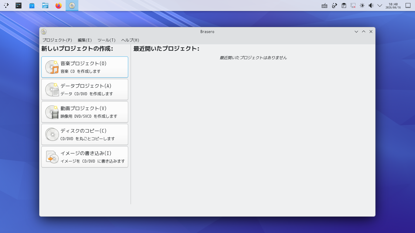 1. 概要 光ディスクライティングソフトとして、「Brasero」を使用します。 2. インストール 「root」ユーザ権限で。 apk add brasero brasero-lang 3. 起動 「スタート」→「マルチメディア」→「Brasero」