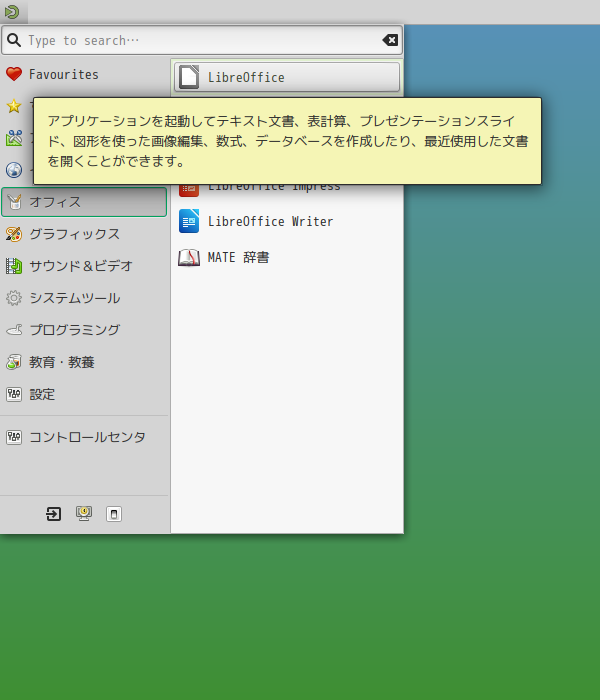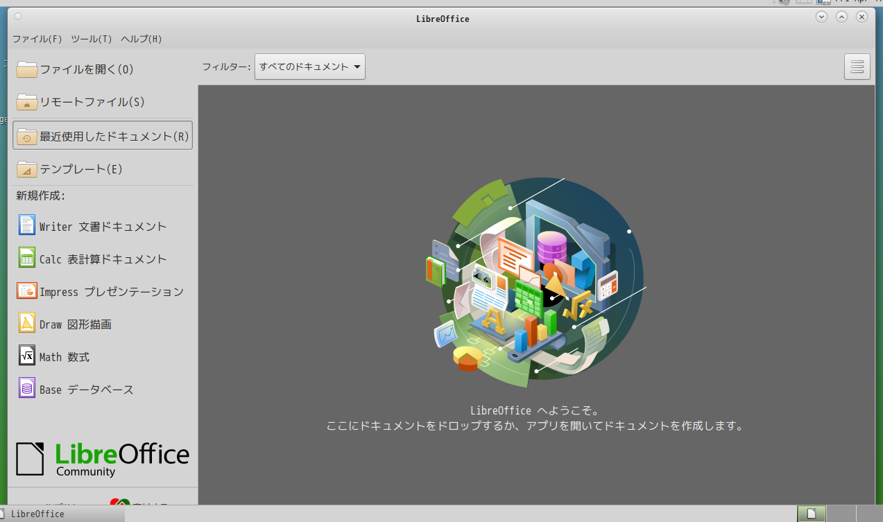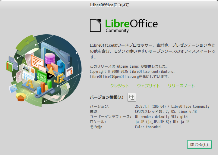1. 概要 オフィススイートとして、「LibreOffice」を使用します。 2. インストール 「root」ユーザ権限で。 apk add libreoffice libreoffice-lang-ja 3. 起動 「スタート」→「オフィス」→「LibreOffice」