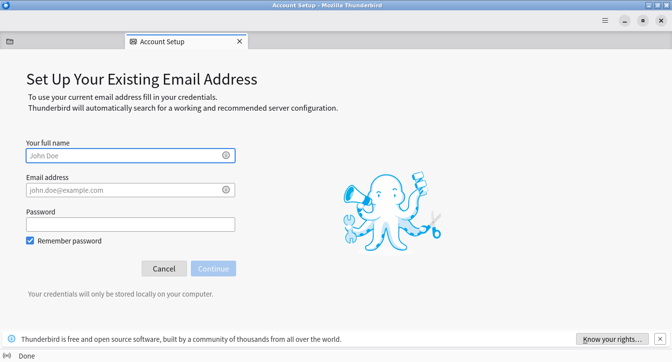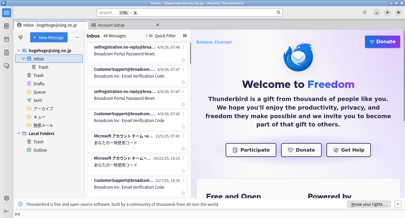 初回起動時は、「アカウント設定」が起動します。 起動直後に、受信ボックスを開いた状態です。 2026年4月20日の時点で、下記のバージョンでした。 「アカウント設定」「日本語化」他、操作方法等は「メール クライアント ソフト - Thunderbird」をご参照ください。 |
