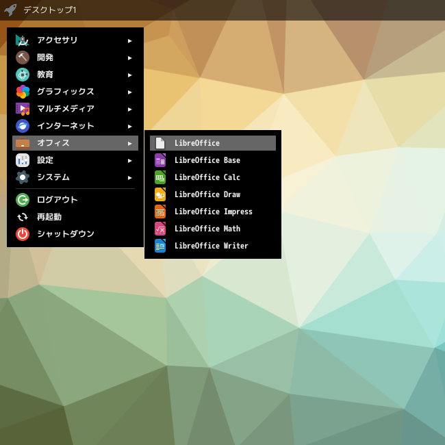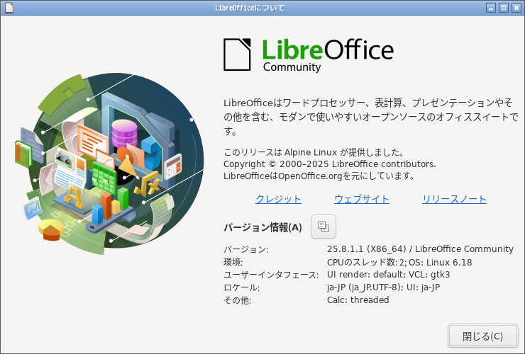 1. 概要 オフィススイートとして、「LibreOffice」を使用します。 2. インストール 「root」ユーザ権限で。 apk add libreoffice libreoffice-lang-ja 3. 起動 「スタート」→「オフィス」→「LibreOffice」