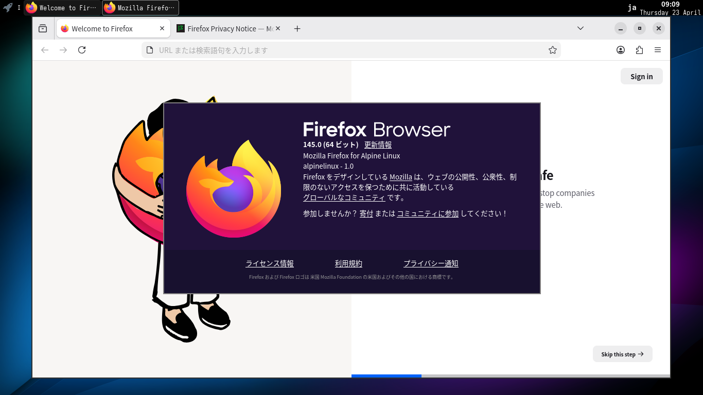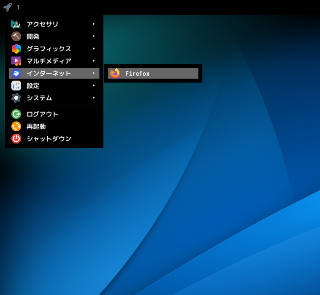 1. 概要 ブラウザとして、「Firefox」を使用します。 2. インストール 「root」ユーザ権限で。 apk add firefox 3. 起動 「スタート」→「ネットワーク」→「Firefox」
