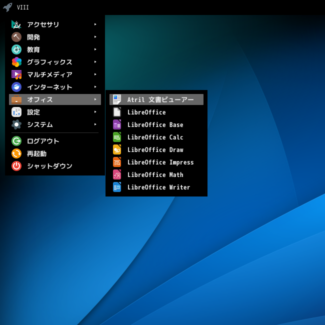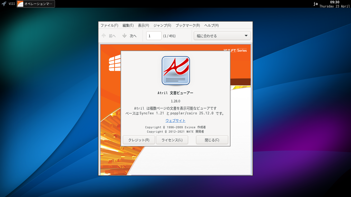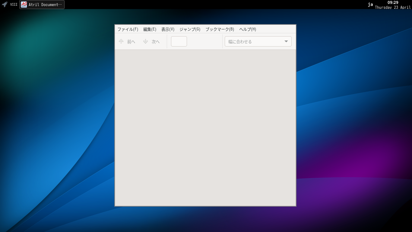 1. 概要 ドキュメントビューアとして、「Atril」を使用します。 2. インストール 「root」ユーザ権限で。 apk add atril atril-lang 3. 起動 「スタート」→「オフィス」→「Atril 文書ビューア」
